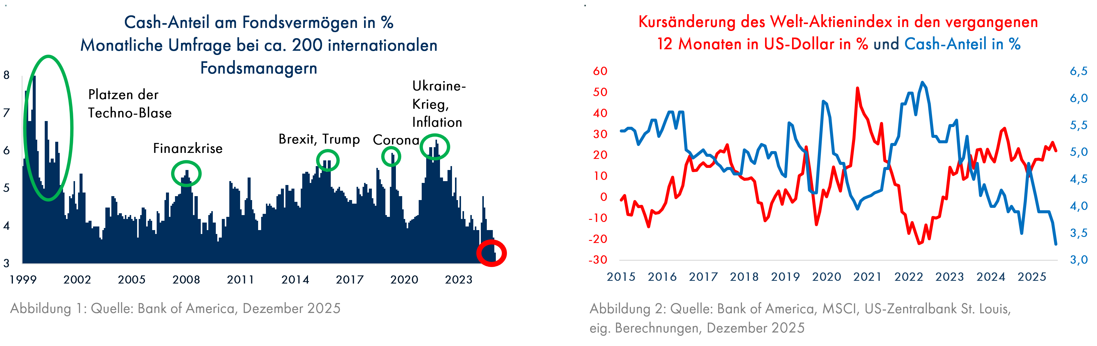 Seit 1999 befragt die amerikanische Großbank Bank of America internationale Aktienfondsmanager zu ihrer Anlagestrategie und der Struktur ihrer Fondsportfolios (Grafik 1). Im Dezember 2025 war der Anteil von Geldmarktanlagen (Cash-Anteil) mit durchschnittlich 3,3% des Fondsvermögens so niedrig wie noch nie. Ein Fondsmanager, der relativ hohe Cash-Anteile hält, ist pessimistisch und erwartet fallende Aktienkurse, denn bei steigenden Aktienkursen wird er schlechter als der Vergleichsindex abschneiden. Demzufolge waren die Aktienfondsmanager seit 26 Jahren noch nie so optimistisch wie jetzt. Seit 2015 kann man gut erklären, worauf dieser Optimismus beruht. Grafik 2 zeigt, dass die Cash-Quoten meistens dann hoch sind, wenn die Aktienkursentwicklung in den vorangegangenen 12 Monaten eher schwach war, wie z.B. zu Beginn der Corona-Krise im Frühjahr 2020 oder nach dem Beginn des Ukraine-Krieges mit dem starken Anstieg von Inflation und Zinsen im Jahr 2022. Dies gilt auch umgekehrt, wie z.B. im Jahr 2021 mit dem Aufschwung nach dem Corona-Schock und einer einmalig günstigen Zinslandschaft. Nie zuvor war der Zins weltweit so niedrig wie zu dieser Zeit. Die Fondsmanager schauen also seit 2015 meistens in den Rückspiegel – die Korrelation zwischen der blauen und der roten Linie in Grafik 2 beträgt -0,75. Dies ist weder auf der Autobahn noch am Aktienmarkt empfehlenswert; irgendwann fliegt man aus der Kurve. Nachfolgend wollen wir untersuchen, in welchen Ecken des Aktienmarktes und bei den nicht börsennotierten Unternehmensbeteiligungen trotz des hohen Optimismus und der Überbewertung vieler Aktienmärkte überdurchschnittlich attraktive Chance-Risiko-Verhältnisse gegeben sind. Dazu betrachten wir zunächst die zu erwartenden Entwicklungen der weltweit immer noch tonangebenden US-Wirtschaft im Jahr 2026.