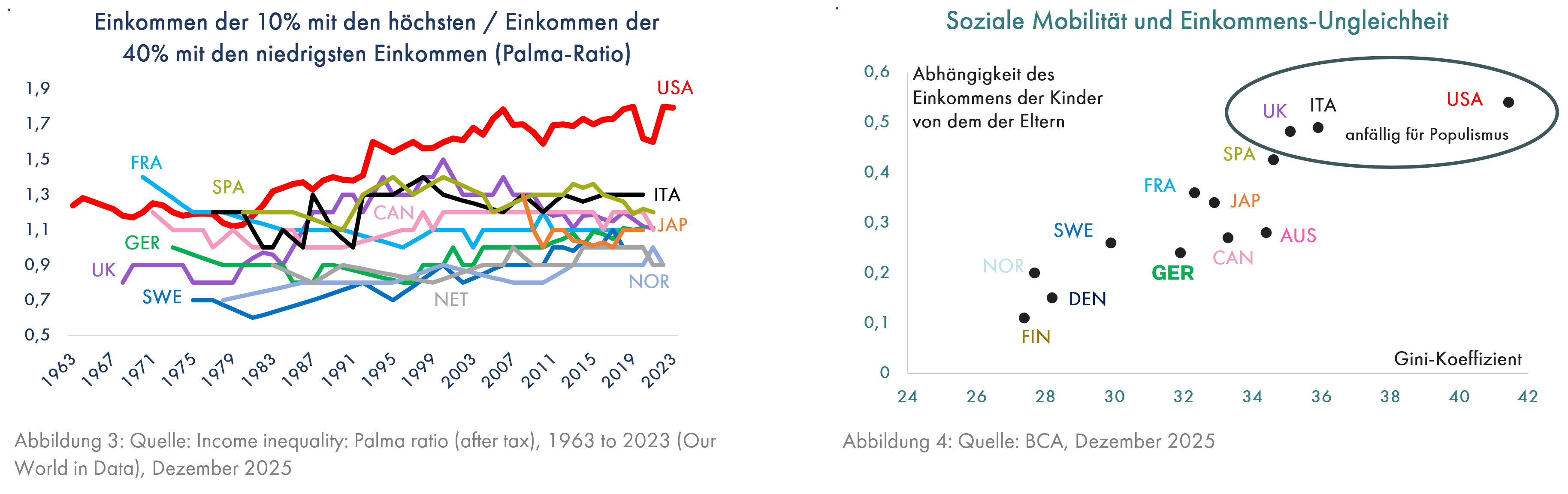 Bekanntlich weisen die USA eine besonders ausgeprägte Ungleichheit der Einkommen auf. Die Palma-Ratio (Grafik 3) zeigt dies deutlich. Weniger bekannt ist, dass das Land der vermeintlich unbegrenzten Möglichkeiten – auch für den sprichwörtlichen Tellerwäscher – diese positive Eigenschaft verloren hat. Die große Einkommensungleichheit, gemessen am Gini-Koeffizienten, der 1 wäre, wenn einer Person das gesamte Einkommen zufließt, oder 0, wenn alle exakt das gleiche Einkommen haben, geht inzwischen mit einer besonders niedrigen sozialen Mobilität einher. Dies bedeutet, dass das besonders ungleich verteilte Einkommen von Amerikanern stärker als in jedem anderen der in Grafik 4 gezeigten Ländern davon abhängig ist, ob ihre Eltern ein hohes oder niedriges Einkommen haben. Bei den Finnen ist dieser Zusammenhang kaum vorhanden, was vielleicht eine der Ursachen dafür ist, dass die Finnen zu den glücklichsten Völkern gehören (Quelle: World Happiness Report 2025). Die Amerikaner sind demnach nicht besonders glücklich und daher auf einen Präsidenten hereingefallen, der ihnen das verspricht, was sie hören wollen, aber tatsächlich z.B. durch Senkung der Unternehmenssteuern oder durch fragwürdige Geschäfte mit Kryptowährungen die Ungleichheit weiter verschärft. Dies wird im nächsten Jahr Auswirkungen auf die Kapitalmärkte haben.
