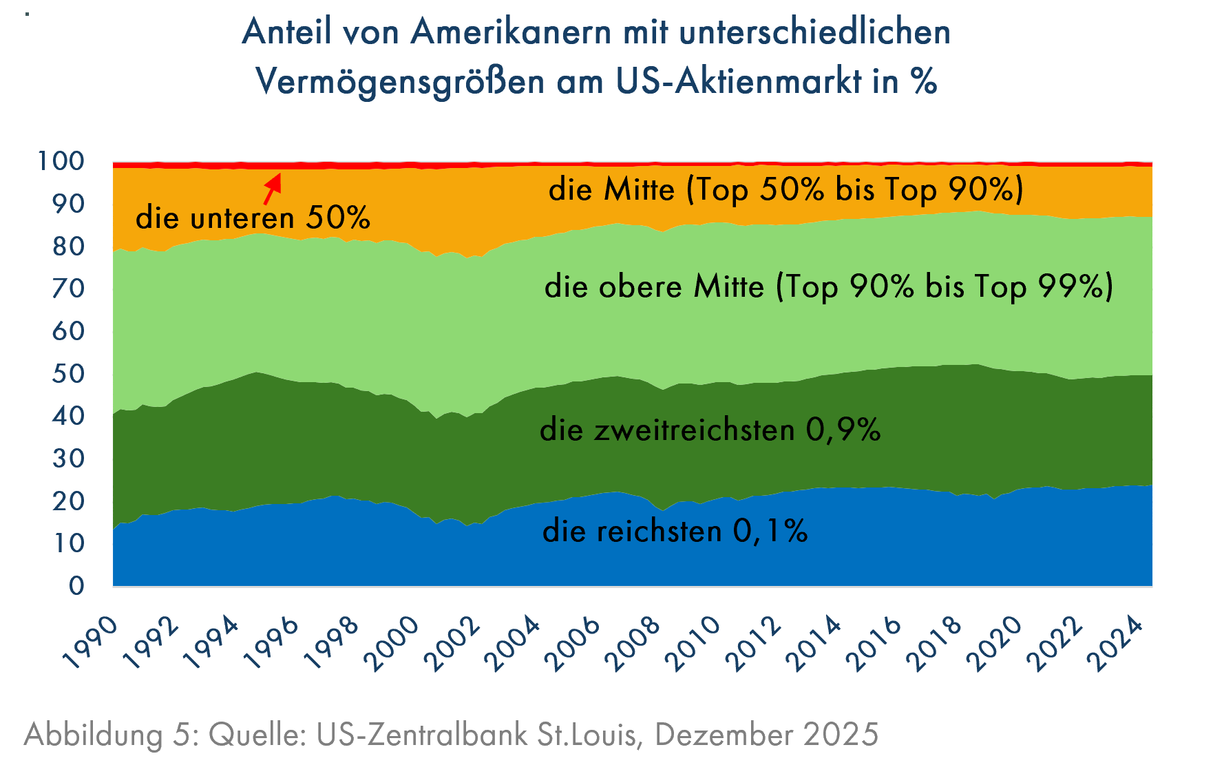 Die seit ungefähr 40 Jahren gegebene ausgeprägte Ungleichheit der Einkommen in den USA (Grafik 3, rote Linie) fördert eine wachsende Konzentration des Reichtums in wenigen Händen. 1990 gehörten 21,5% des Wertes aller US-Aktien den ärmeren 90% aller Amerikaner, aber im 2. Quartal 2025 ist deren Anteil auf nur noch 12,8% gesunken (rote und orange Fläche in Grafik 5).