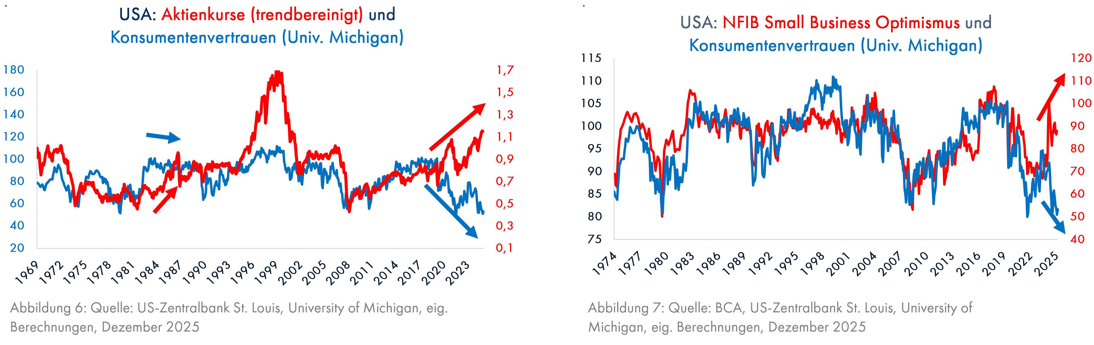 Dadurch entsteht eine seit über 50 Jahren nicht dagewesene entgegengesetzte Entwicklung des Konsumentenvertrauens zum Aktienmarkt (Grafik 6) und zum Optimismus bei den kleineren US-Unternehmen (Grafik 7). 90% der Amerikaner haben kaum vom Anstieg der Aktienkurse profitiert, anders als die reichsten 0,1%, deren Anteil am Aktienmarkt von 14,6% auf 24% gestiegen ist (blaue Fläche). Die höhere, teilweise durch Trumps Zollpolitik angeheizte Inflation trifft die Superreichen nicht, den Durchschnittsamerikaner dagegen schon. Dabei interessiert uns hier nicht die Förderung marxistischen Gedankenguts, sondern die für Kapitalanleger relevanten Folgen dieser Entwicklungen.