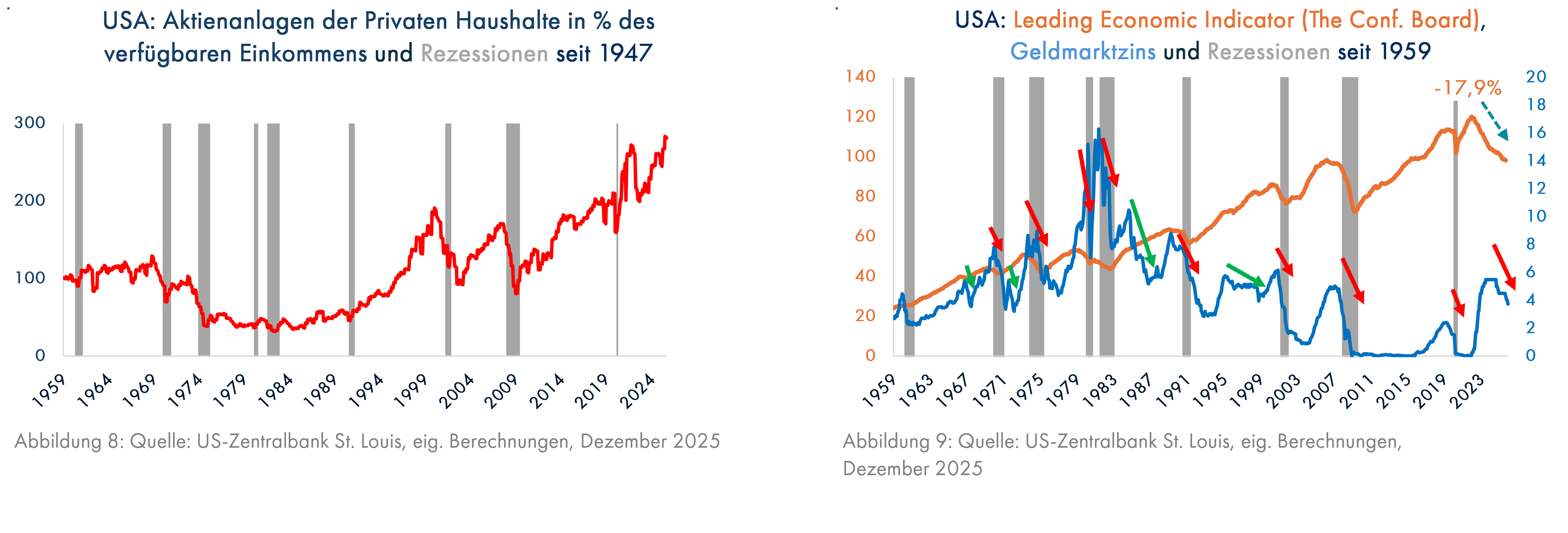 Die Privaten Haushalte in den USA verfügen direkt oder indirekt (Investmentfonds) aktuell über Aktienanlagen im Wert von 65.000 Mrd. US-Dollar. Eine Faustregel besagt, dass ein Wertzuwachs der Aktien von 10%, das entspricht 6.500 Mrd. US-Dollar, den Konsum um 0,4% bzw. 260 Mrd. US-Dollar steigert („Wealth Effect“, Quelle: BCA, Dez. 2025). Bei Kursverlusten ist ein entsprechender Konsumrückgang zu erwarten.