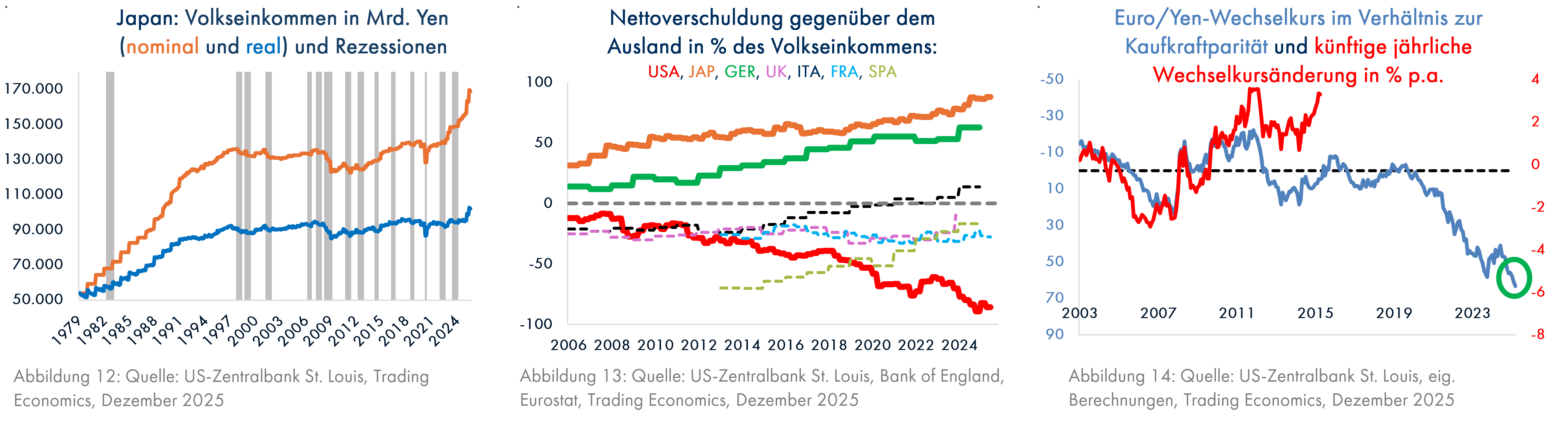 Trumps Zinssenkungsanstrengungen kommen jedoch in einem Jahr, in dem andere Länder ihren Leitzins erhöhen, z.B. Japan, oder zumindest nicht senken werden (Eurozone). Das Land der Aufgehenden Sonne war seit Mitte der 90er Jahre bis 2020 das Land der stagnierenden Wirtschaft. Mit der durch Corona und den Ukraine-Krieg ausgelösten weltweiten Inflation begann in Japan zunächst die nominale (Grafik 12, orange Linie) und seit Anfang 2025 auch die reale Wirtschaftsleistung (blaue Linie) kräftig zu steigen. Damit entstehen mehr attraktive Investitionsmöglichkeiten im Inland, so dass Auslandsinvestitionen weniger interessant werden. Die Japaner dürften wie auch die Deutschen bei einem fallenden US-Dollar einen erheblichen Teil des riesigen Auslandsvermögens (Grafik 13, Werte über 0 entsprechen einem Nettovermögen) ins Inland zurückholen und ihre Gelder vermehrt dort einsetzen, was ihre Währungen stärken und den US-Dollar weiter schwächen wird. Der Yen ist ohnehin stark unterbewertet (Grafik 14), was die Wirtschaft unterstützt und den Kapitalabzug aus dem Ausland beschleunigt, da der Wert des Auslandsvermögens bei steigendem Wechselkurs in Yen gerechnet sinken wird.