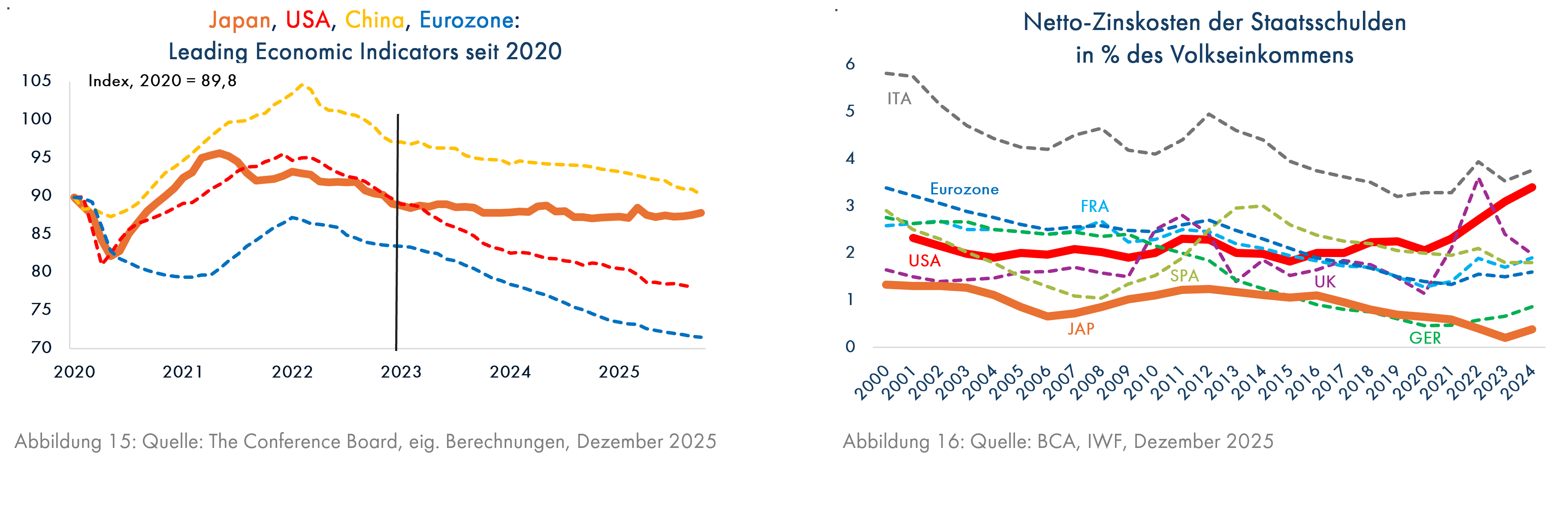 Die günstigen Aussichten der japanischen Wirtschaft lassen sich auch an den Leading Economic Indicators der US-Researchfirma The Conference Board ablesen. Seit Anfang 2023 sind sie für Japan stabil (Grafik 15), während sich die Aussichten in den drei großen Wirtschaftsräumen der Welt (USA, China, Eurozone) im selben Zeitraum kontinuierlich verschlechtert haben. In Japan werden sie sich durch ein geplantes großes Konjunkturpaket zumindest kurzfristig weiter verbessern (Quelle: Handelsblatt vom 15.11.2025).
