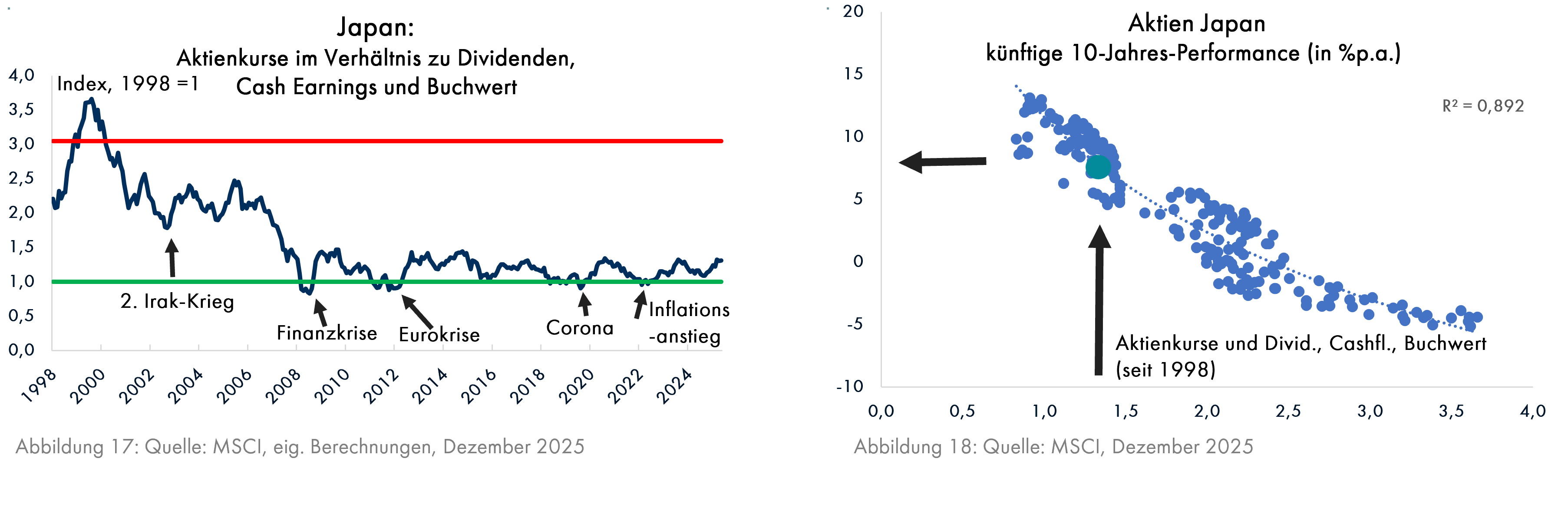 Die Belastung der Staatsfinanzen aufgrund der Zinskosten steht einer Ankurbelung der Wirtschaft in Ländern wie Japan oder Deutschland nicht im Wege, ganz im Gegensatz zu den USA (Grafik 16). Damit können sich die Gewinne der japanischen Firmen, die ohnehin sehr günstig bewertet sind (Grafik 17), weiter verbessern. Die Ertragserwartung liegt für die nächsten 10 Jahre bei 8% p.a. (Grafik 18); hinzu kommen vermutlich deutliche Wechselkursgewinne für ausländische Anleger.