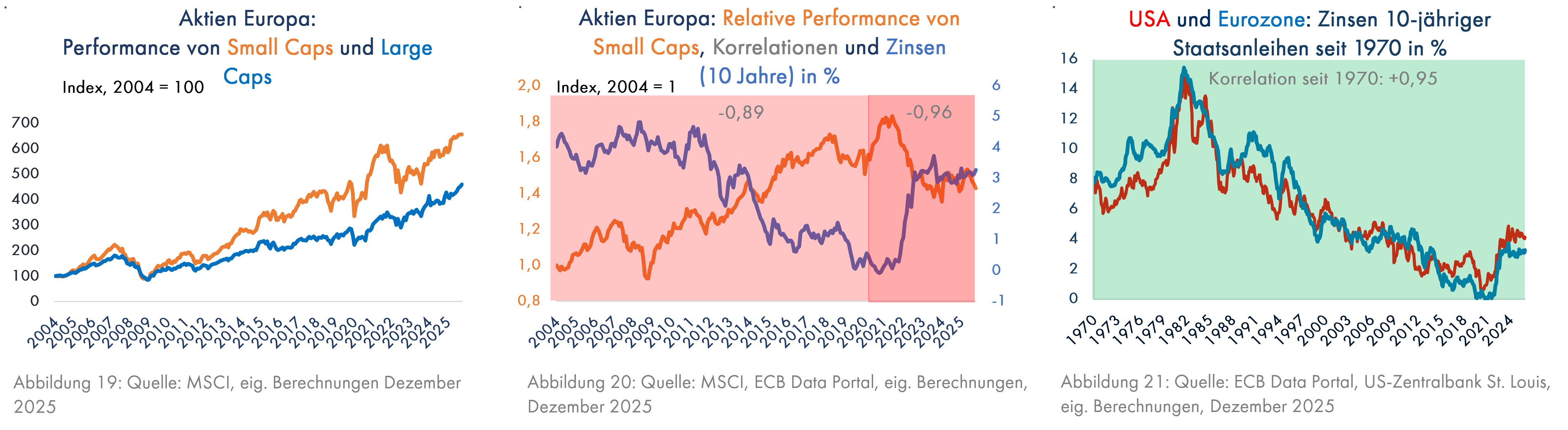 Eine weitere attraktive Anlagemöglichkeit bietet sich bei kleineren Firmen (Small Caps) in Europa. Diese haben sich seit über 20 Jahren deutlich besser entwickelt als die großen Firmen (Large Caps, Grafik 19), außer in der Zeit seit 2021 (sinkende orange Linie in Grafik 20). Der Grund dafür liegt in den in diesem Zeitraum stark gestiegenen Zinsen in der Eurozone, die seit 2020, aber auch schon vorher, zur relativen Outperformance von Small Caps in einem extrem negativen Zusammenhang standen (eine Korrelation von -0,96 bedeutet, dass steigende Zinsen fast immer mit einer sinkenden relativen Performance der Small Caps verbunden waren). In einer Zeit, in der die Amerikaner den langfristigen Zins senken müssen, wird er in anderen entwickelten Ländern mit hoher Wahrscheinlichkeit ebenfalls sinken (Grafik 21). Dies hilft den Small Caps. Amerika gibt eben auch beim langfristigen Zins den Ton an.