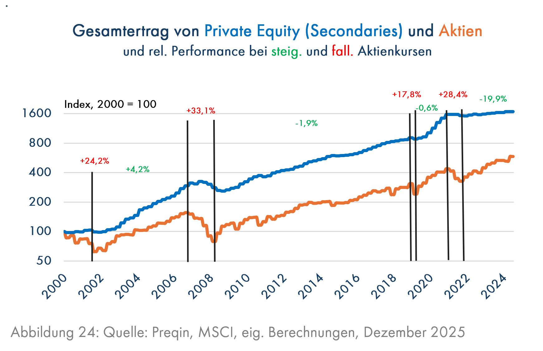 Eine weitere Anlagemöglichkeit, die in den nächsten Jahren mit einem besonders günstigen Verhältnis der Chancen zu den Risiken ausgestattet ist, sind globale Secondary-Fonds (Grafik 24), die den Besitzern von Private-Equity-Fonds ihre Anteile abkaufen, wenn sie Liquidität benötigen. Dies geschieht häufig mit einem gewissen Abschlag auf den Wert der Fondsanteile. Insgesamt war dieses Geschäftsmodell insbesondere in Zeiten fallender Aktienkurse sehr vorteilhaft. Die roten Ziffern in Grafik 24 zeigen die Outperformance von Secondary-Fonds in den Phasen deutlich fallender Aktienkurse, die zwischen 17,8% und 33,1% lag. Wenn die Aktienkurse stiegen, konnten die Secondary-Fonds knapp mithalten, außer in der starken Aktienhausse seit dem 3. Quartal 2022, als die Aktienperformance weltweit insgesamt 79% bis zum 2. Quartal 2025 erreichte, erheblich beflügelt durch die KI-Euphorie, während die Secondary-Fonds nur 10% schafften. Insgesamt hat Kapital, das seit dem Jahr 2000 in Secondary-Fonds angelegt war, einen jährlichen Gesamtertrag von 12% p.a. erwirtschaftet, während Aktien nur 7,3% p.a. schafften. In künftigen Zeiten holpriger Aktienkursentwicklung könnte sich eine Anlage in den wenig riskanten, aber dennoch ertragsstarken Secondary-Fonds als sehr rentabel erweisen.