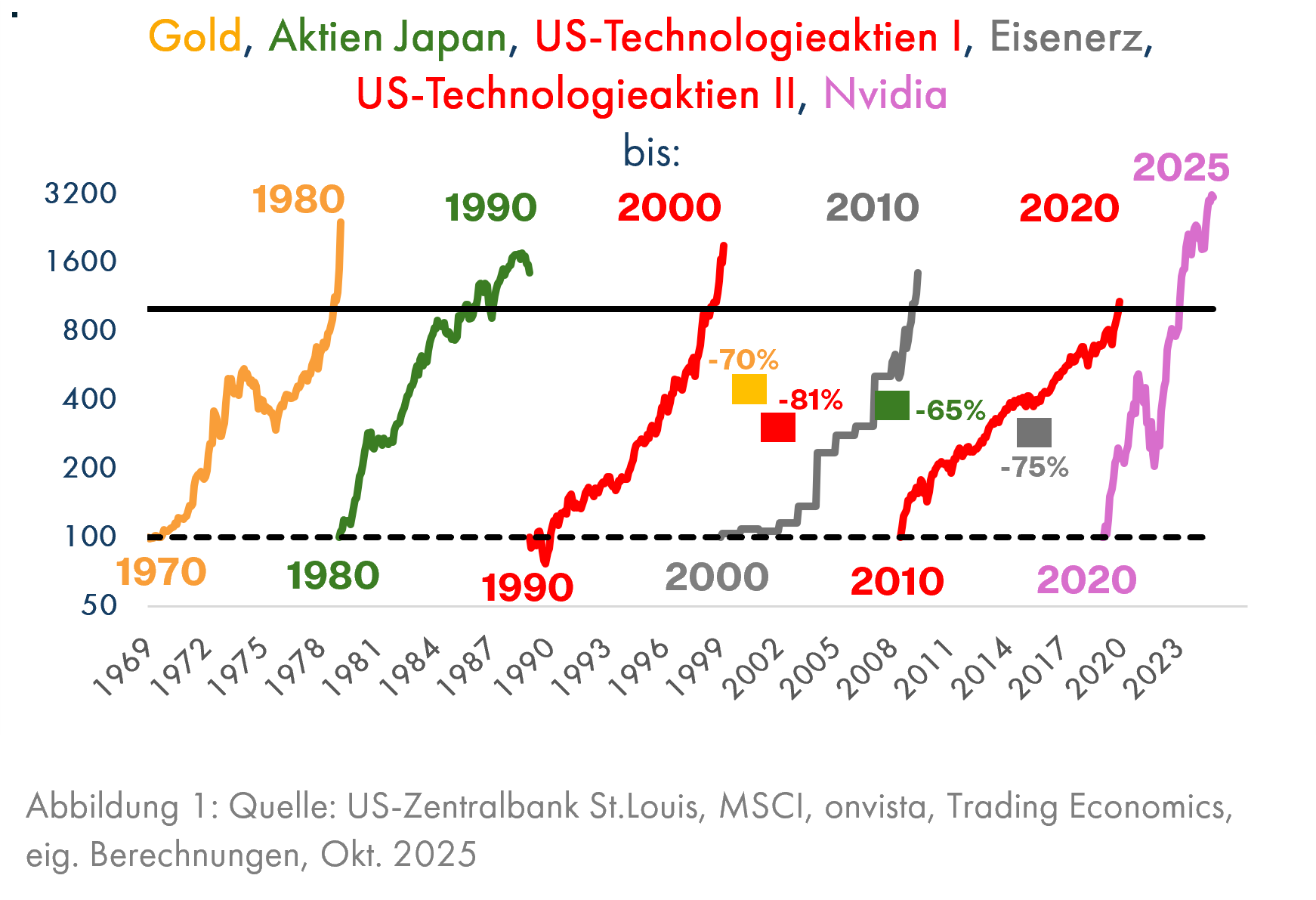 Seit den 70er Jahren hatte jedes Jahrzehnt seine prägende Blase, die am Beginn des nächsten Jahrzehnts mit lautem Knall und heftigen Kursverlusten zu platzen pflegte (Grafik 1). Bei den ersten 4 Blasen ist auch der nachfolgende Tiefststand bekannt, bei dem eine neue Aufwärtsbewegung einsetzte (siehe die 4 Quadrate in Grafik 1).