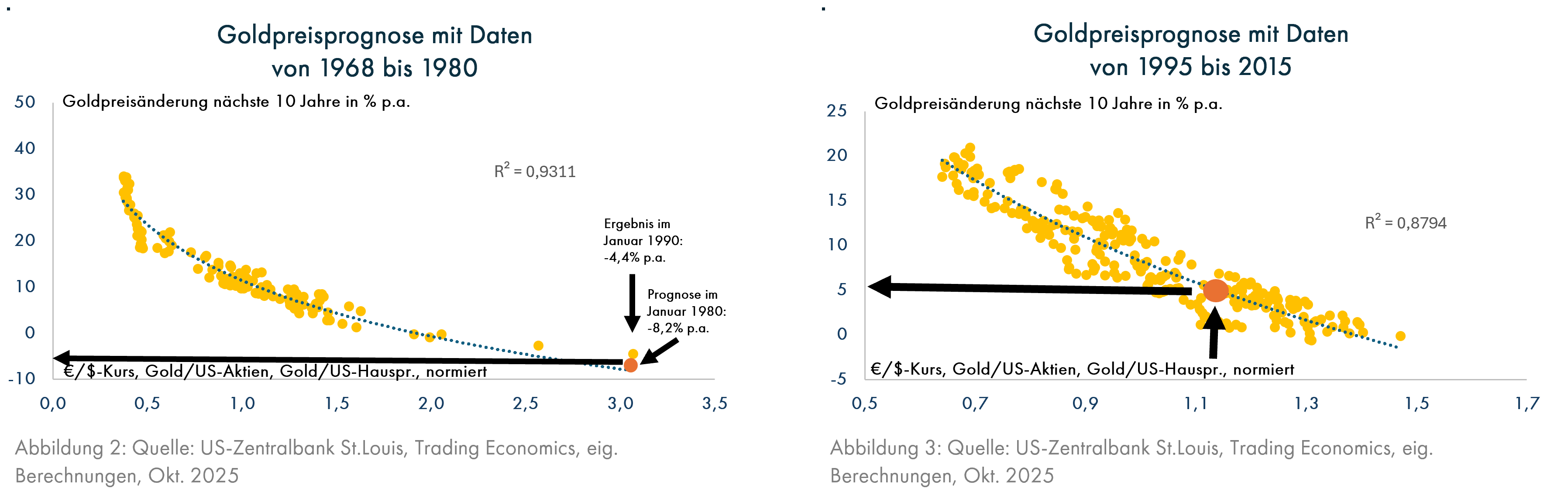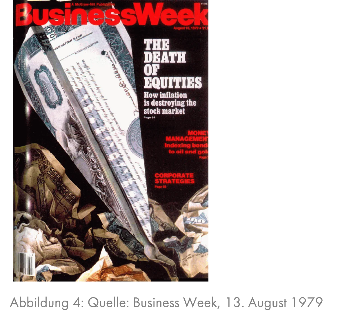 Beginnen wir mit der Gold-Euphorie der 70er Jahre. Wir verwenden im Jahr 2025 für die Goldprognose das Verhältnis des Goldpreises zu US-Aktien und US-Wohnimmobilien, weil sie ebenfalls Sachwertanlagen sind. Als dritten Faktor beinhaltet das Modell den Wechselkurs des US-Dollars seit 1968, als die Golddeckung des Dollars aufgehoben wurde und ein Anleger seitdem alternativ zum Gold auch verzinsliche Dollar-Anlagen verwenden kann, wenn die Kursaussichten des Dollars attraktiv sind. Wenn dieses Modell mit den Daten von 1968 bis Januar 1980 berechnet wird, weist es einen ungewöhnlich hohen Wert der Kennziffer R² auf. Diese liegt zwischen 0 – dann besteht in diesem Modell keinerlei Zusammenhang zwischen den Einflußfaktoren und der nachfolgenden Goldpreisentwicklung – und 1; dann wäre immer exakt die Goldpreisentwicklung nach den 10 folgenden Jahren prognostiziert worden. Der R²-Wert von 0,93 ist nur wenig kleiner als 1. Mit den Daten von Januar 1980 für das Verhältnis des Goldpreises zu US-Aktien und US-Wohnimmobilien sowie dem Wechselkurs des Dollars sagte das Modell einen künftigen jährlichen Wertverlust des Goldes von 8,2% bis zum Januar 1990 vorher. Es wurden dann zwar „nur“ -4,4% p.a., aber die Anleger waren im Januar 1980 im absoluten Goldrausch, perfekt vergleichbar mit den aktuellen euphorischen Erwartungen rund um das Thema KI. Die Inflation stieg damals überall an und die Geopolitik bereitete große Sorgen; in Persien war Anfang 1979 der Schah gestürzt worden und die neue antiwestliche Regierung unter Ayatollah Khomeini sorgte für stark steigende Ölpreise, was damals wesentlich wichtiger war als heute. Dazu überfiel die Sowjetunion im Dezember 1979 Afghanistan. Für „normale“ Wertpapiere wie Aktien und Anleihen interessierte sich niemand mehr; die Wirtschaftszeitung „Business Week“ titelte „The Death of Equities“ (Grafik 4). Man interessierte sich für Gold, Silber und Öl, vielleicht noch Immobilien. Anfang der 80er Jahre begann jedoch die größte Aufwärtsentwicklung von Aktien (siehe Grafik 5 mit der Entwicklung bis 2000, heute sind die Kurse noch höher) und Anleihen, die bei Aktien bis heute und bei Anleihen immerhin bis 2021 gedauert hat. Gold, Silber und Öl verloren dagegen in den nächsten 20 Jahren mindestens 60%. Auch heute steigt plötzlich die Euphorie bei den Edelmetallen, aber das Prognosemodell, das mit 0,88 ebenfals einen hohen R²-Wert aufweist, gibt noch kein Ausstiegssignal (Grafik 3, das Kurspotenzial liegt noch bei ca. 5% p.a.).