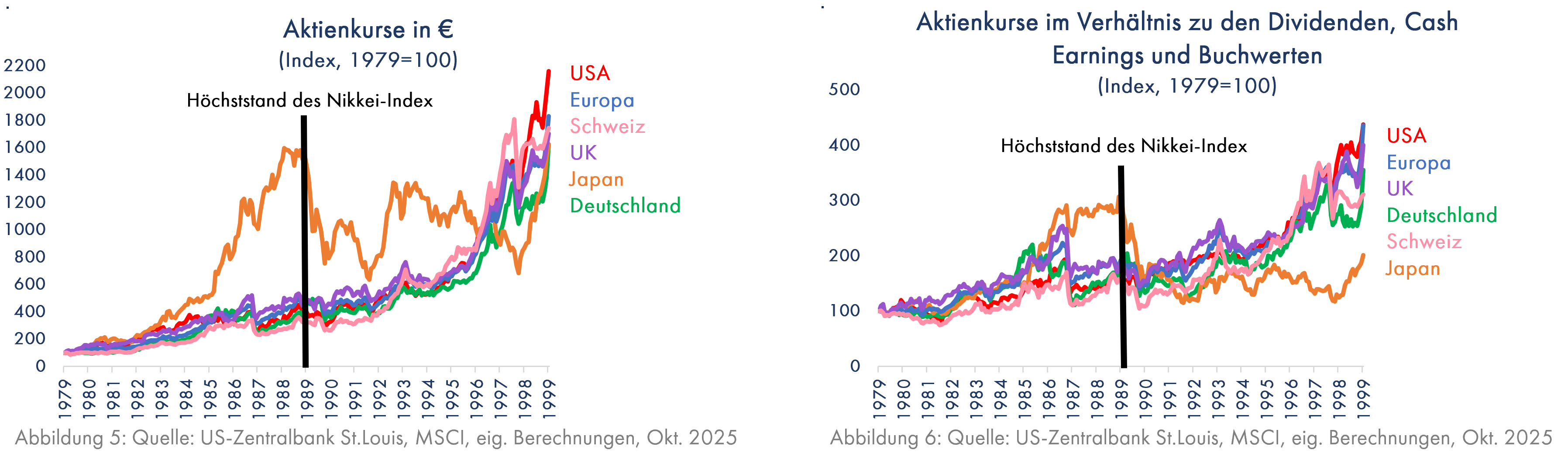 Die nächste Blase bildete sich in Japan. Auf dem Höhepunkt der dortigen Aktienkurse im Januar 1990 gab es die weltweite Überzeugung, dass Hochtechnologieprodukte künftig überwiegend aus Japan stammen werden. Japanische Aktien waren in den 10 Jahren seit 1979 wesentlich stärker gestiegen als im Rest der Welt (Grafik 5); allerdings ging es dann jahrelang nur in Japan nach unten.