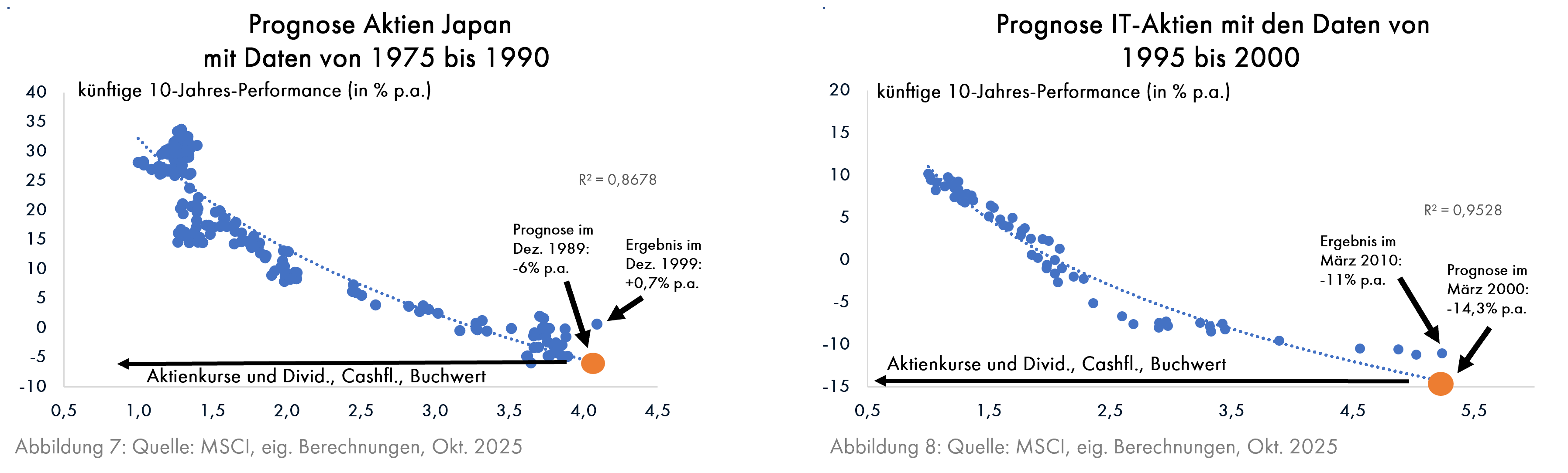 Ebenso verhielt es sich mit der Bewertung (Grafik 6). Diese lässt sich bei Aktien sehr gut für Prognosemodelle verwenden (Grafik 7). Mit den von 1975 bis zum Januar 1990 vorhandenen Daten ergibt ein Prognosemodell, das mit den Dividendenrenditen, den Preis-/Buchwert-Verhältnissen und den Aktienkursen im Verhältnis zu den Bruttogewinnen ausgestattet ist, bei einem erneut sehr hohen R²-Wert von 0,87 eine Prognose von -6% p.a. bis zum Januar 2000. Die tatsächliche Kurssteigerung war dann +0,7% p.a.. Angesichts der Tatsache, dass die übrigen in Grafik 5 gezeigten Aktienmärkte in diesem Zeitraum jährliche Kursgewinne von 13% (UK) bis 19% (USA) erreichten, sich also mindestens verdreifachten (siehe Grafik 5), hat Japan seine damals zahlreichen Fans trotzdem bitter enttäuscht.