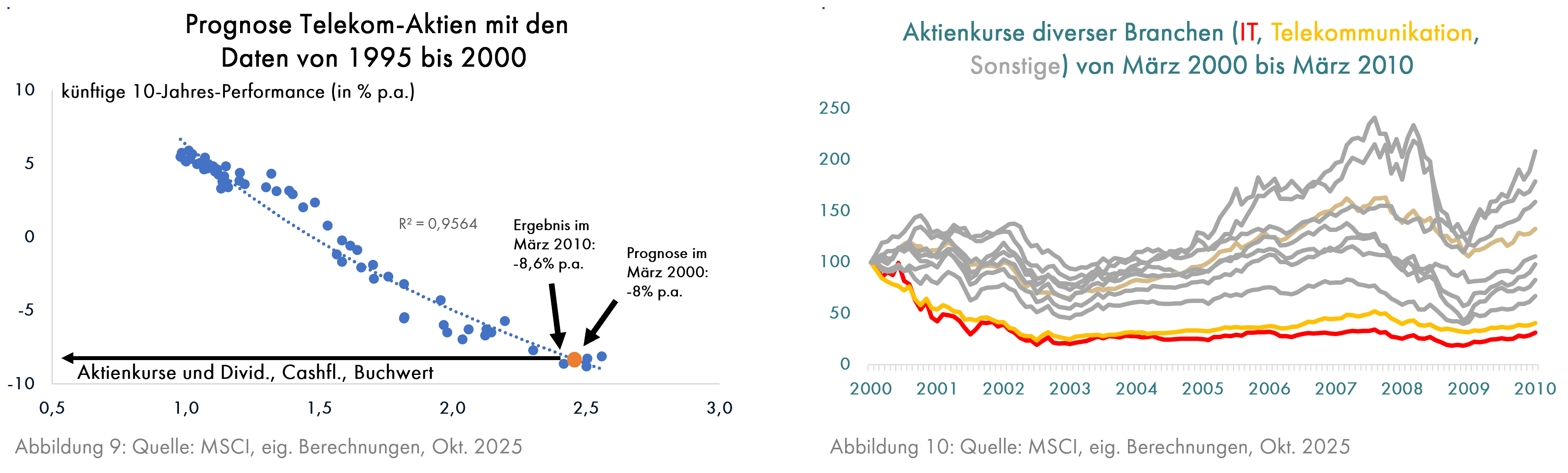 In den 90er Jahren boomten dann die IT- und Telekomaktien und erreichten im März 2000 ihren höchsten Stand. Die dazugehörigen Prognosemodelle mit exakt dem gleichen Aufbau wie das Japan-Modell (Prognose aufgrund der Dividendenrenditen, Preis-/Buchwert-Verhältnisse und Aktienkurse im Verhältnis zu den Bruttogewinnen) sagten in diesem Monat jährliche Kursverluste in Höhe von 14,3% bei IT-Aktien (Grafik 8) und 8% bei Telekom-Aktien (Grafik 9) voraus; 10 Jahre später waren die Aktien dieser Branchen tatsächlich mit -11% p.a. bzw. -8,6% p.a. besonders stark gefallen; alle anderen Branchen des weltweiten Aktienindex von MSCI verzeichneten deutlich bessere Ergebnisse (Grafik 10).
