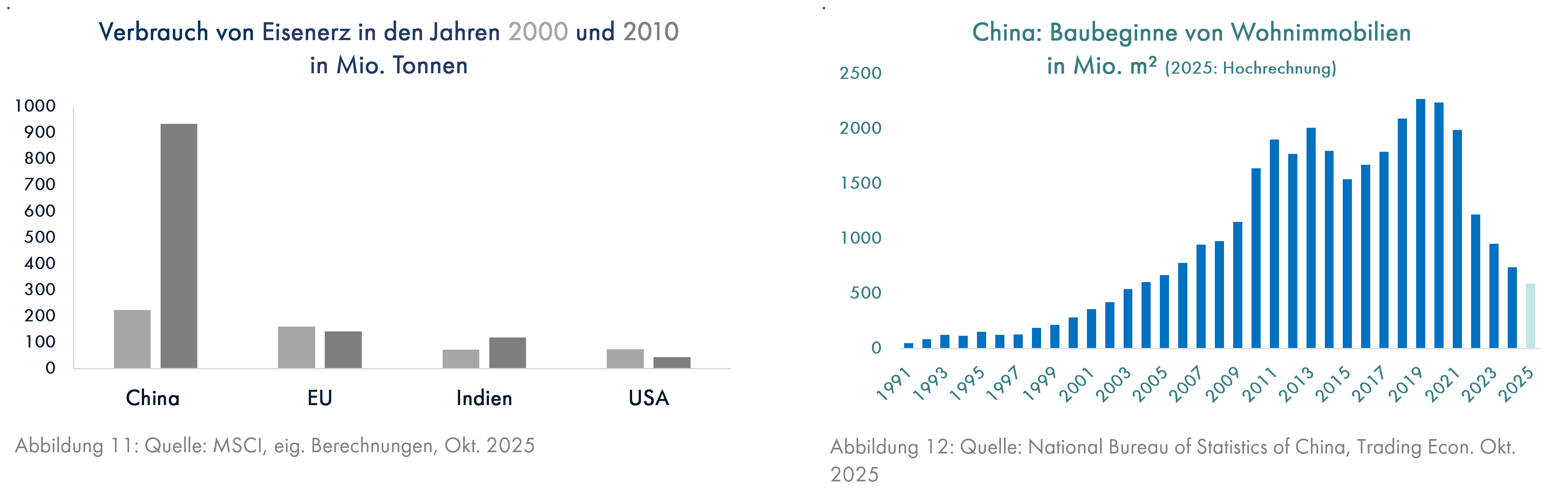 Die erste Dekade des neuen Jahrtausends war dann von dem massiven Bauboom in China geprägt, der erheblichen Einfluss auf die Preise von vielen Rohstoffen hatte, die beim Bauen benötigt werden. Dabei war Eisenerz als Vorprodukt für Baustahl der einzige wichtige Rohstoff, dessen Preis um mehr als das Zehnfache anstieg (Grafik 11). Leider erwiesen sich die gewaltigen Bauinvestitionen – Grafik 12 zeigt als krasses Beispiel den Wohnungsbau, wo die Zahl der fertiggestellten Quadratmeter von 283 Mio. im Jahr 2000 auf 1.640 Mio. im Jahr 2010 anstieg – als Kapitalverschwendung. Heute stehen bis zu 90 Mio. Wohnungen leer (Quelle: Neue Zürcher Zeitung vom 4.9.2023) und belasten die chinesische Wirtschaft, weil diese Wohnungen Kreditzinsen verursachen, aber keine Mieterträge bringen und daher der Konsum von Wohnungseigentümern in China seit Jahren schwächelt. Weitere Details zur chinesischen Immobilienblase finden Sie hier im Kapitalmarktausblick vom September 2022. Die Wohnimmobilienpreise stiegen auch nach 2010 weiter an, bis die Immobilienliebhaber das gigantische Überangebot erkannten (Grafik 13). Seitdem ist die Wohnungsbautätigkeit bei fallenden Preisen um 75% eingebrochen. Die auch im internationalen Vergleich absurd aufgeblähte Bautätigkeit läßt sich auch aus Grafik 11 ablesen.