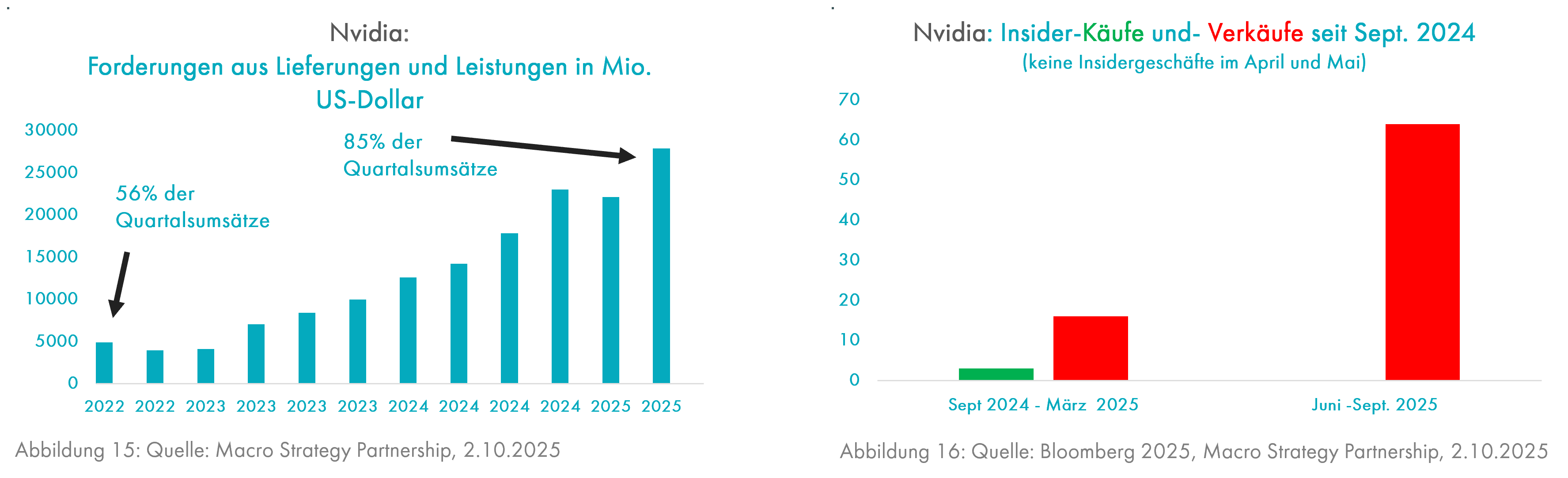 Damit sind wir bei der letzten Blase angekommen, nämlich dem Boom der Technologieaktien seit 2010, der ab 2022 durch die KI-Euphorie viele Elemente früherer Blasen bekam. Eine davon ist die übertriebene Investitionstätigkeit, die sich beispielsweise auch am deutschen Immobilienmarkt während des durch massive Steuervorteile ausgelösten Baubooms nach der deutschen Wiedervereinigung als präziser Frühindikator der ab 1995 sehr schwachen Preisentwicklung bei deutschen Wohnimmobilien erwiesen hatte (Grafik 14). Die Unternehmensberatung McKinsey schätzt, dass weltweit bis 2030 6.700 Mrd. US-Dollar in KI-Rechenzentren investiert werden. Wenn die Hälfte davon auf die USA entfallen, wären dies pro Jahr rund 2% des US-Volkseinkommens. Erweisen sich diese Investitionen allerdings als unrentable Kapitalverschwendung, würden sie sicher stark eingeschränkt werden, was die US-Konjunktur deutlich belasten dürfte. Ein Hinweis auf mögliche Rentabilitätsprobleme bietet OpenAI, die Firma, die ChatGTP betreibt. Dieses KI-Modell hat 700 Mio. wöchentliche Nutzer, aber fast 90% davon verwenden nur die kostenlose Version (Quelle: t-online, 19.10.2025). Aufgrund der bisher nicht vorhandenen Profitabilität vieler KI-Firmen leiht Nvidia, größter Anbieter von Microchips zum Training von KI-Modellen in den Rechenzentren, den Käufern seiner teuren Chips das zum Bezahlen notwendige Geld (Grafik15). Die Schulden der Kunden von Nvidia beliefen sich im 2. Quartal 2025 auf 28 Mrd. US-Dollar bzw. 85% der Umsätze in diesem Quartal.
