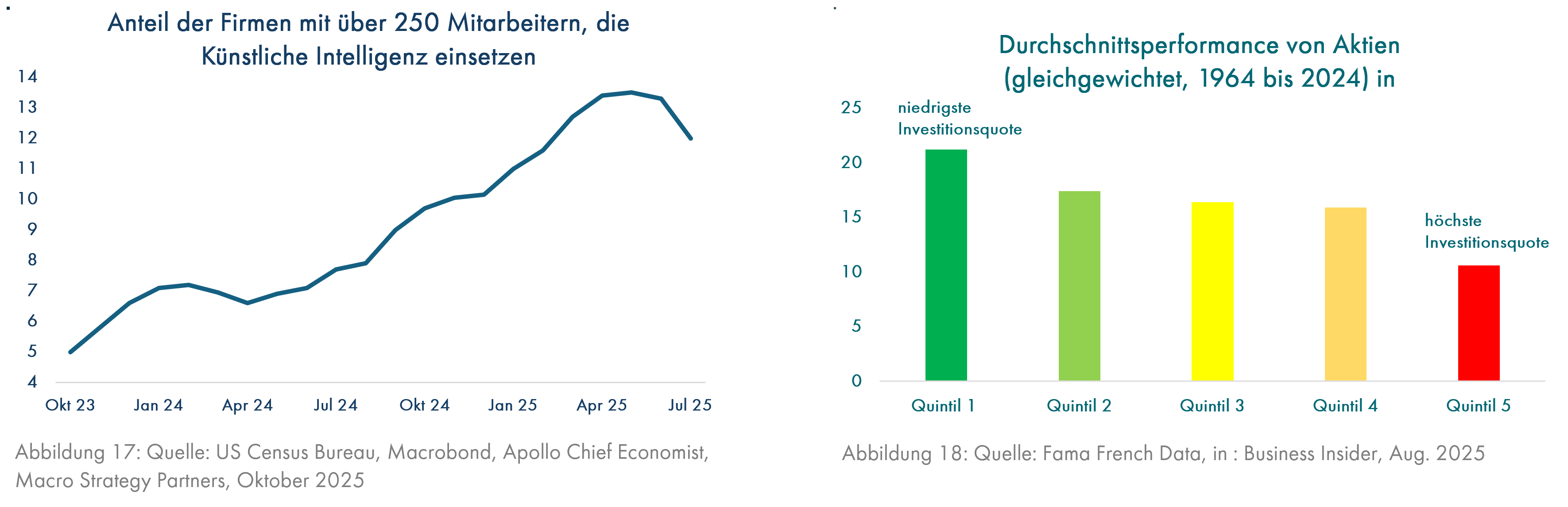 Offenbar finden auch die Insider der Firma Nvidia dieses Geschäftsgebaren, das die Nachfrage nach Nvidia-Chips hochhalten soll, auch wenn die Kunden klamm sind, fragwürdig und verkaufen eifrig Aktien (Grafik 16). Während es in den 2 Quartalen bis März 2025 noch 3 Insider-Käufe bei 14 Verkäufen gab – dann war wegen Trumps erratischen Zollandrohungen und Rücknahme der Drohungen im April und Mai Ruhe -, wurden von Juni bis September 2025 64 Insider-Verkäufe gemeldet. Kein einziger Insider hatte noch Interesse an einem Kauf. Dazu mag auch der im Sommer 2025 erstmals eingetretene deutliche Rückgang des Anteils von Firmen mit über 250 Mitarbeitern, die KI einsetzen, beigetragen haben (Grafik 17).