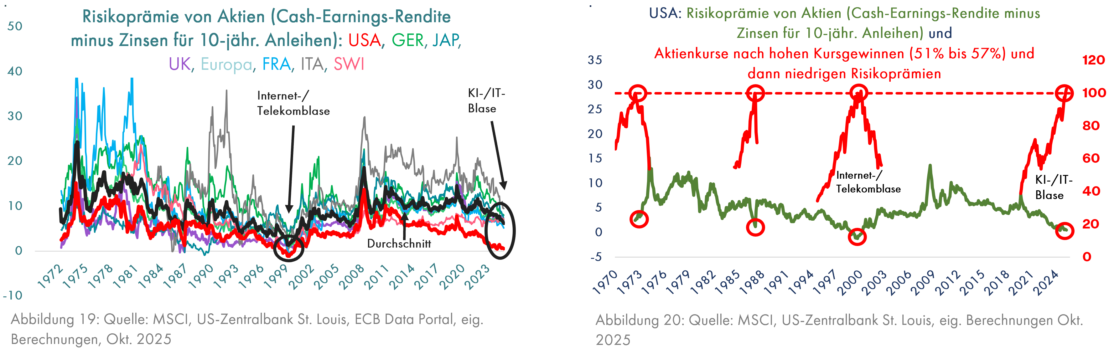 Vor diesem Hintergrund fällt die hohe Bewertung des gesamten US-Aktienmarktes auf. Während der Internet- und Telekomblase des Jahres 2000 waren alle großen Aktienmärkte im Vergleich zu Staatsanleihen stark überbewertet (Grafik 19) – die Risikoprämien der Aktien eines jeden Landes gegenüber den eigenen Staatsanleihen war in den USA bei Null, aber auch im Durchschnitt der anderen Länder nur knapp darüber, was bedeutet, dass die erwarteten Renditen für schwankungsanfällige Aktien nicht höher waren als die für Staatsanleihen. Im Jahr 2025 ist die Risikoprämie nur am US-Aktienmarkt mit 0,7% p.a. fast wieder bei Null, aber in den übrigen Ländern mit 6,2% p.a. weitaus höher (Grafik 19, im Durchschnitt der 53 Jahre seit 1972 war diese Risikoprämie von Aktien sogar bei 9,4%).