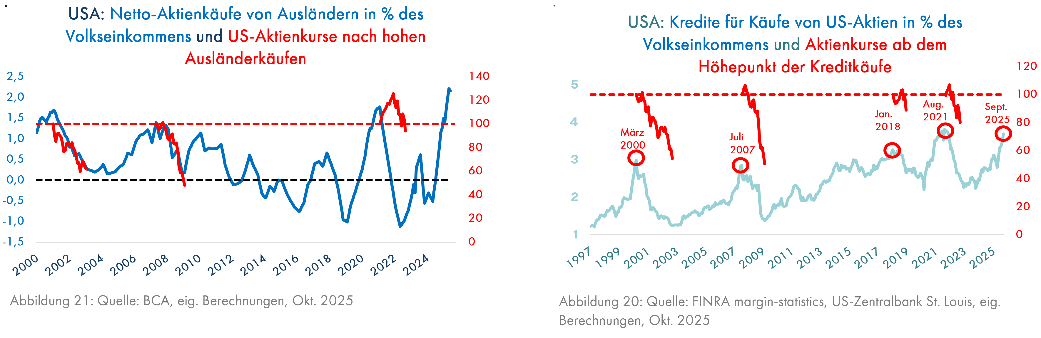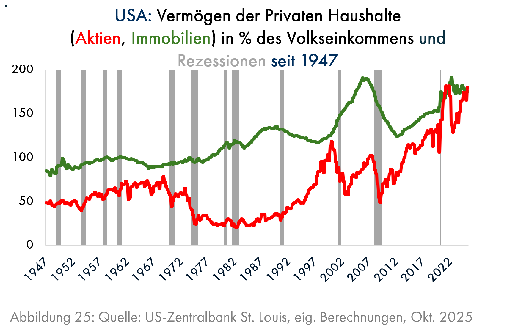 Darunter versteht man den Einfluss von Änderungen des Vermögens auf die Konsumausgaben. Gita Gopinath, Wirtschaftsprofessorin an der Harvard Universität und frühere Chefvolkswirtin des Internationalen Währungsfonds, schätzt, dass ein Aktiencrash in der Größenordnung des Platzens der Internet- und Telekomblase des Jahres 2000 erheblich ernstere Folgen für die Wirtschaft – auch außerhalb der USA – haben dürfte als vor 25 Jahren (Quelle: The Economist, 18. Okt. 2025). Ein Grund für ihre Annahme ist die im Vergleich zum Jahr 2000 wesentliche höhere Aktienquote der Amerikaner, aber auch der Ausländer, insbesondere der Europäer, am amerikanischen Aktienmarkt, ein weiterer die hohe Staatsverschuldung, die ähnliche Konjunkturhilfen wie nach dem Jahr 2000 unwahrscheinlich macht. Beunruhigend ist auch die Beobachtung, dass der Wert von Aktien im Vermögen der Amerikaner zum ersten Mal seit 1947 in den Jahren 2021 – danach folgte ein deutlicher Kursrückgang (Grafik 22) – und 2025 so hoch war wie der Wert von Immobilien (Grafik 25). Zuvor hatte der Aktienbesitz im Oktober 1968 und im März 2000 fast denselben Wert wie der Immobilienbesitz; die nachfolgenden Kurverluste von Aktien betrugen 30% und 46%. Sollten nicht nur die Werte des Aktien-, sondern auch des Immobilienvermögens fallen, wäre die negative Wirkung für die Wirtschaft besonders groß.
