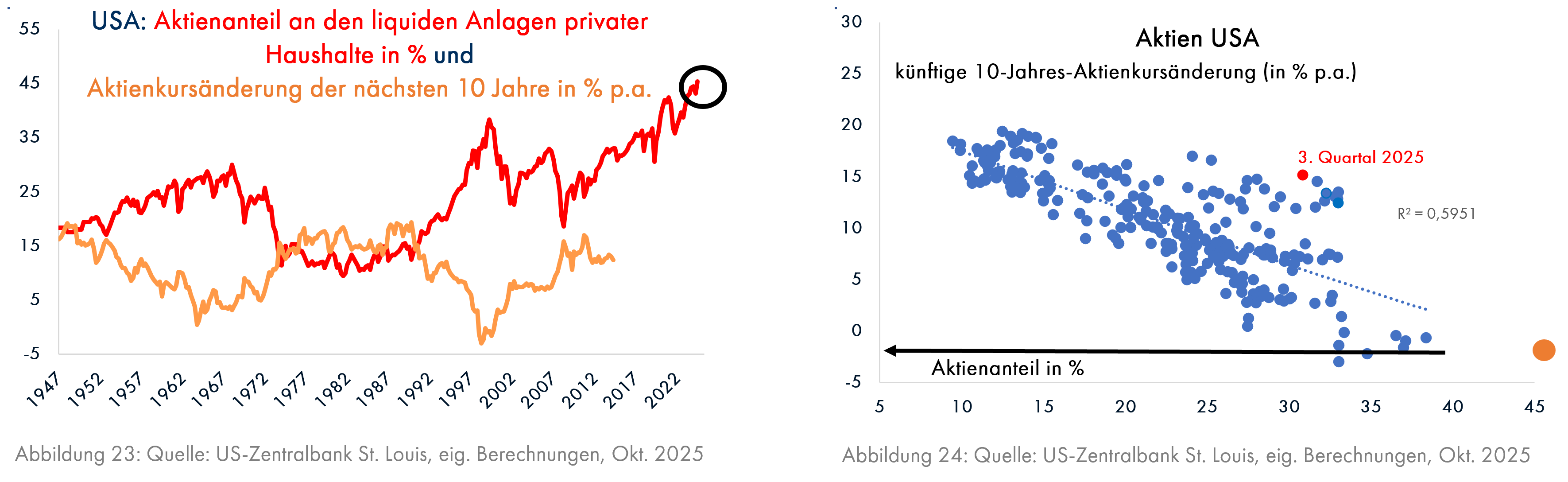 Zusammenfassend zeigt sich die aktuelle Euphorie an der rekordhohen Aktienquote der amerikanischen Privathaushalte, die seit 1947 von der US-Zentralbank gemessen wird (Grafik 23). Zu einer solchen Aktienquote passen negative Ertragserwartungen (Grafik 24), weil es kaum noch jemanden gibt, der noch keine Aktien hat; die Zahl der künftigen potenziellen Käufer ist also besonders klein. Im Jahr 1989 hatten 29% der amerikanischen Durchschnittsverdiener Aktien, im Jahr 2022 waren es 60% (Quelle: The Economist, 11. Okt. 2025). Wenn jetzt die Aktienkurse fallen sollten, schlägt der „Wealth Effect“ zu, eine weithin übersehene Gefahr.
