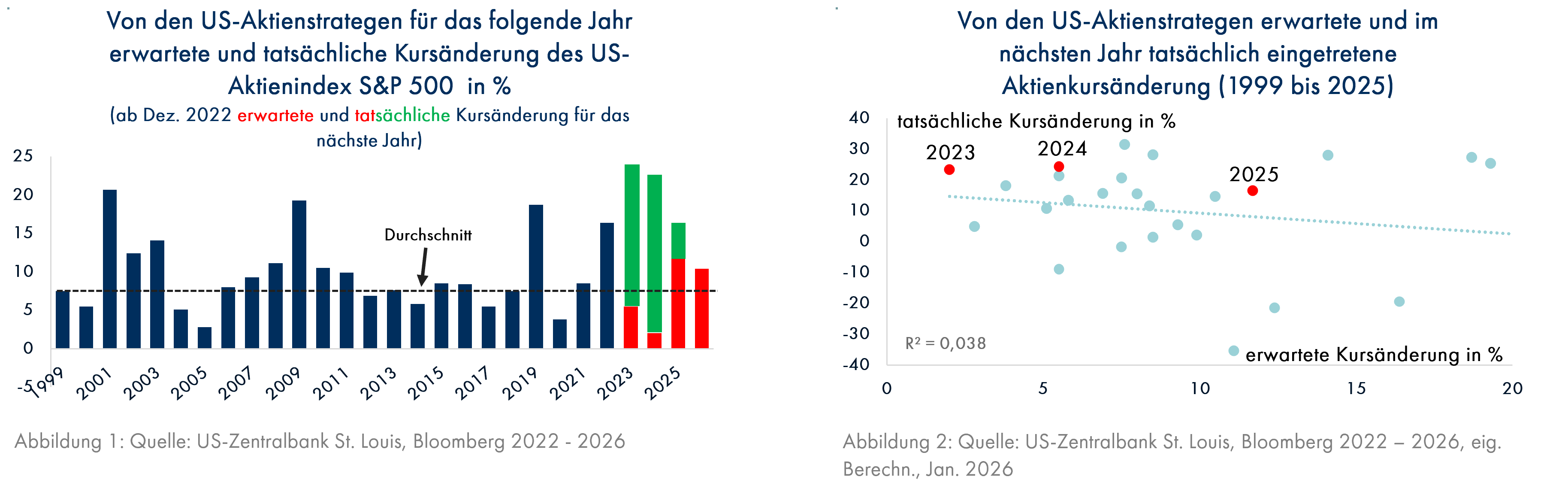 Von Bloomberg werden seit 1999 am Jahresende die für die Prognose der Kursentwicklung von US-Aktien zuständigen Aktienmarktstrategen befragt, welche Kursänderungen sie im folgenden Jahr erwarten (Grafik 1). Insbesondere in den letzten Jahren war die Trefferquote nicht sehr gut; ohnehin gab es zwischen den Vorhersagen und der tatsächlichen Kursentwicklung fast keinen Zusammenhang (Grafik 2, die Zahl R², die zwischen 0 (kein Zusammenhang) und 1 (perfekter Zusammenhang) liegen kann, beträgt 0,038). Nachdem man Ende 2022 mit einer Prognose von durchschnittlich + 16,4% für 2023 weit danebenlag – der Aktienmarkt fiel stattdessen um fast 20% –, waren die Profis in den beiden folgenden Jahren mit Prognosen von + 5,5% und + 2% wesentlich vorsichtiger, aber nicht besser, denn die Aktienkurse gingen um 24% bzw. 23% nach oben. Glücklicherweise machen wir keine kurzfristigen Prognosen, denn das Ausmaß, in dem die Euphorie beim Thema Künstliche Intelligenz (KI) die Kurse einiger großer Technologiewerte hochtrieb, haben auch wir angesichts des wenig rosigen Umfelds nicht erwartet. Aktuell wird ein etwas überdurchschnittlicher Kursanstieg von 10,4% vorausgesagt. Das dürfte diesmal zu optimistisch sein.