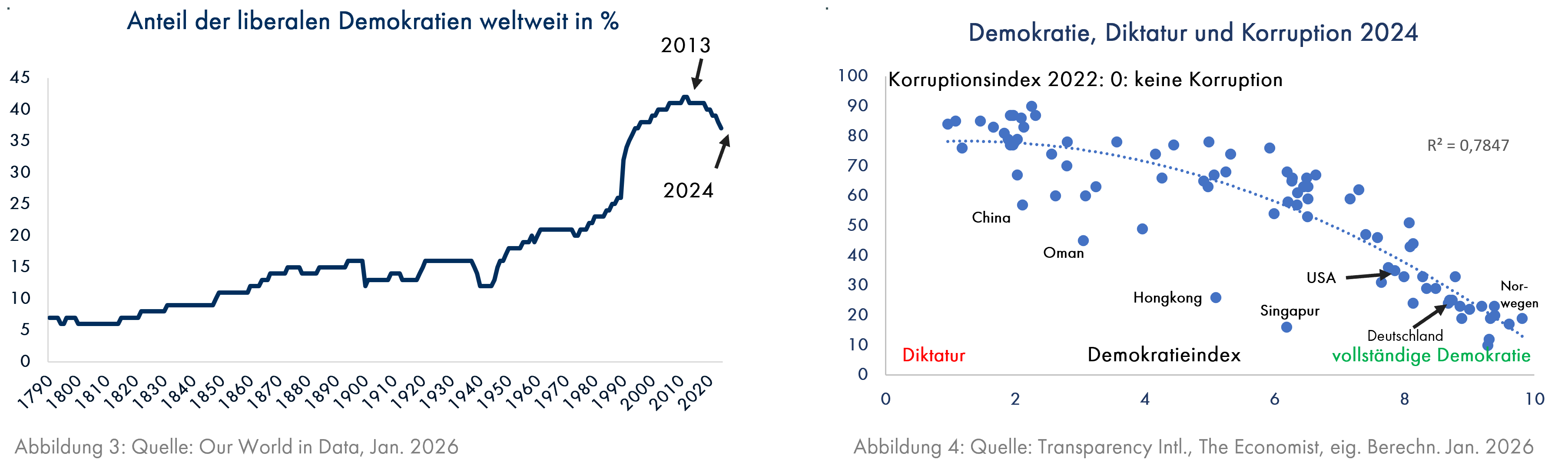 Der Anteil der Demokratien sinkt weltweit, aber für die Anhänger von populistischen und diktatorischen Politikern ist das keine gute Nachricht; deren Politikansatz ist seit über hundert Jahren nachweislich für das davon befallene Land schädlich. Wenn Trumps Versuche, die Zinsen stark zu senken, erfolgreich sind, wird es zwar in den USA ein kurzes Strohfeuer geben – vielleicht auch auf dem Aktienmarkt –, aber auf Kosten einer höheren Inflation und eines schwachen Dollars. Europa und auch andere Regionen könnten jedoch auf vielfache Weise von Trumps Politikchaos profitieren; das Gold ist schon jetzt ein klarer Gewinner der Trump-Ära.