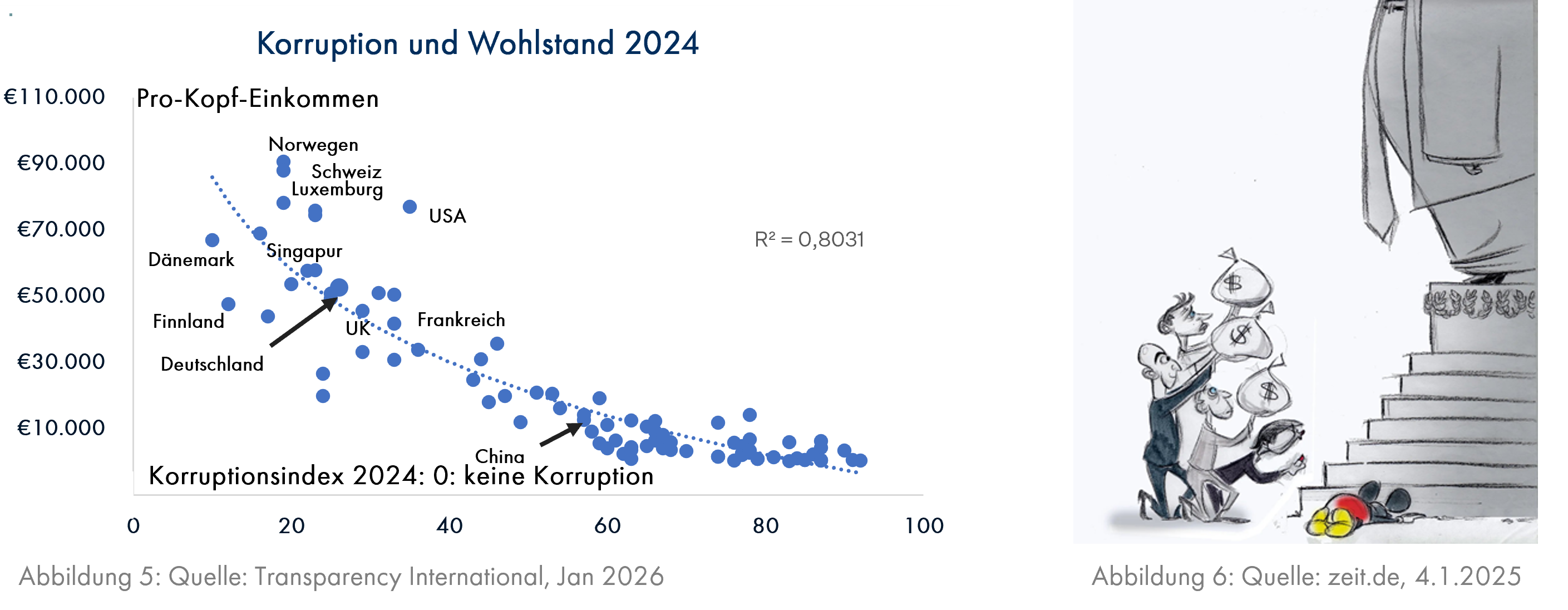 Leider ist Maduro bisher der einzige Diktator, der in den letzten Jahren seine Macht verloren hat. Noch sind die Demokratien auf dem Rückzug (Grafik 3). Dies ist jedoch für die Wähler von Diktatoren keine gute Nachricht. Je undemokratischer ein Staat ist, umso höher ist die Korruption (Grafik 4) und umso ärmer ist das Land (Grafik 5).