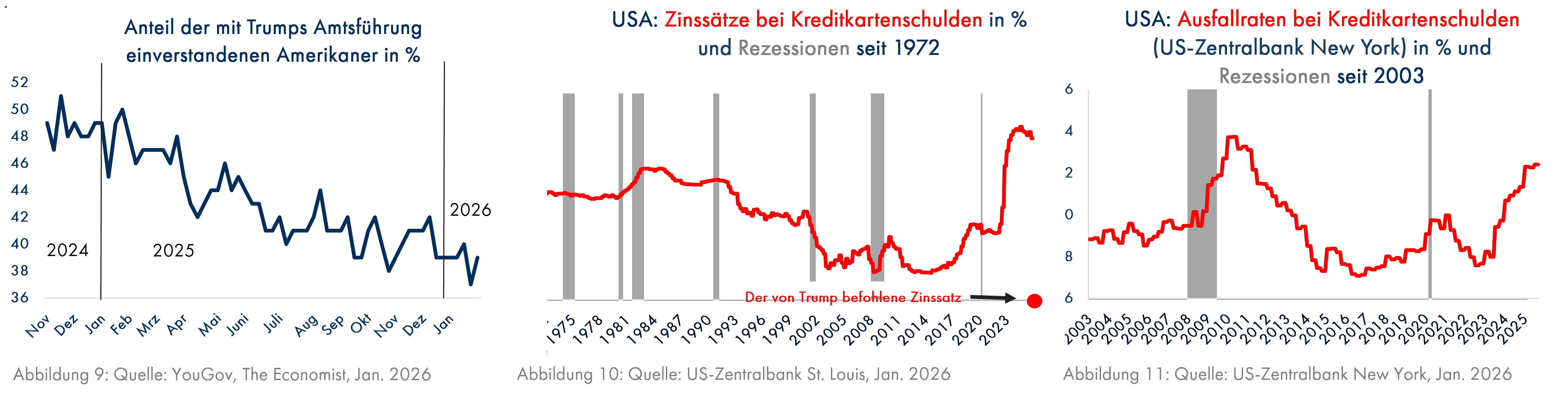 Nun unternehmen wir einen Blick in den Maschinenraum der ökonomischen Fehler von Diktatoren am Beispiel von Donald Trump. Dabei treten fragwürdige Vorgänge zutage, die aber einige Lichtblicke aufweisen, insbesondere für Kapitalanlagen außerhalb der USA. Zunächst ist festzuhalten, dass die Zustimmung zu Trumps Amtsführung seit seinem Amtsantritt vor 12 Monaten erfreulich stark gesunken ist (Grafik 9; neuerdings wagen sogar US-Konzernchefs Kritik, die zunächst über Trumps Machtergreifung erfreut waren (Quelle: spiegel.de vom 26.1.2025)). Da im Herbst die Zwischenwahlen stattfinden, bei denen Trump ein erheblicher Machtverlust droht, muss er nun zu Tricks greifen, die für die US-Wirtschaft schädlich sind. Im Kapitalmarktausblick vom Dezember 2025, den Sie hier finden, hatten wir darauf hingewiesen, dass Trump sinkende Zinsen braucht, um die Zwischenwahlen im Herbst 2026 gewinnen zu können. Nun wird er aktiv. Vor wenigen Tagen hat er verlangt, dass die Zinssätze für Kreditkartenschulden – für viele ärmere Amerikaner die einzige Möglichkeit, Kredite zu erhalten –, auf 10% gesenkt werden müssen (Grafik 10, Quelle: Handelsblatt, 15.1.2026), allerdings – er hält sich für richtig clever – nur für 1 Jahr. Dann sind die Zwischenwahlen gelaufen. Jamie Dimon, der renommierte Chef der größten US-Bank, JPMorgan, hat dazu angemerkt, dass damit kaum noch Kreditkartenschulden erhältlich sein werden, da die Ausfallrate dieser Kredite mit 12,4% sogar höher ist als die erlaubten Zinsen (Grafik 11).