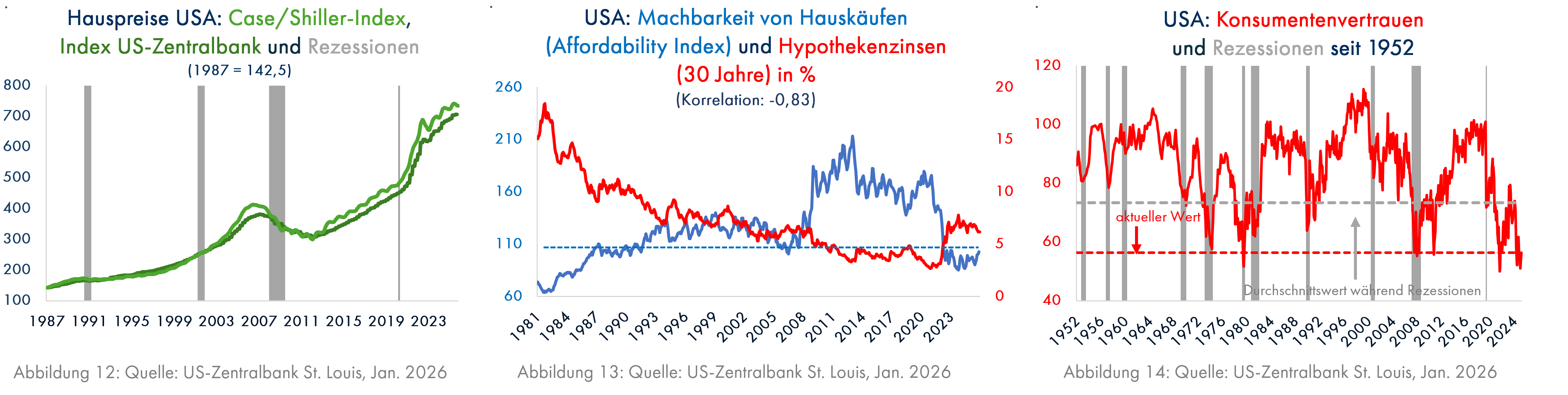Wenn Trump, der unternehmerfreundliche Präsident, die Banken zwingt, das Kreditangebot nicht einzuschränken, wirkt die Zinssenkung natürlich vorübergehend stimulierend, aber auch inflationstreibend und schwächt das Vertrauen in die Verlässlichkeit des US-Finanzsystems. Eine weitere neue Maßnahme ist das künstliche Absenken der Zinsen für langfristige Hypothekendarlehen. Trump kündigte auf seinem Propagandakanal „Truth Social“ einen massiven Ankauf von Hypothekenanleihen im Volumen von anfänglich 200 Mrd. US-Dollar an, um damit Immobilienkredite günstiger zu machen (Quelle: Wirtschaftswoche, 9.1.2026). Da die Wohnimmobilienpreise in den USA (Grafik 12) jedoch trotz des Anstiegs der Hypothekenzinsen ab 2021 (rote Linie in Grafik 13) auf historische Höchststände gestiegen sind, ist die Machbarkeit von Hauskäufen sehr niedrig (blaue Linie in Grafik 13). Dies wiederum ist eine wichtige Ursache für die schlechte Stimmung der Konsumenten in den USA (Grafik 14). Eine Senkung der langfristigen Hypothekenzinsen würde die Machbarkeit von Hauskäufen sofort verbessern (Grafik 15).