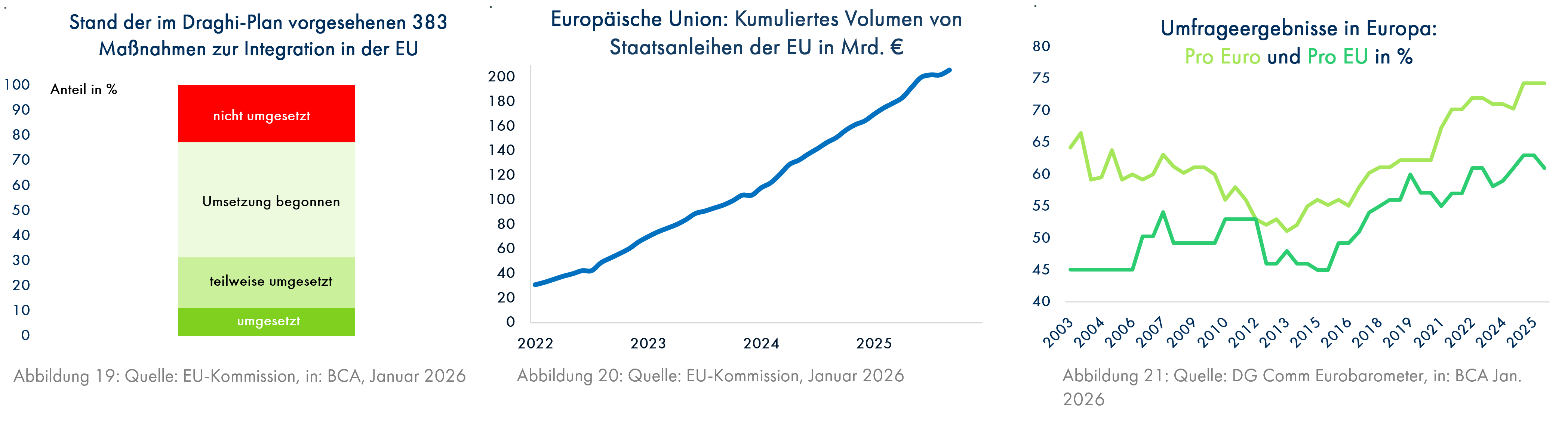 Ein fallender US-Dollar wird wie schon seit der Machtergreifung von Trump vor einem Jahr zu einer weiteren Underperformance des US-Aktienmarktes führen, zumal die Europäer jetzt endlich zusammenrücken und die Wirtschaft stärken werden. 31% der 383 Vorschläge des Ex-EZB-Präsidenten Mario Draghi zur Stärkung der Wirtschaft in der EU wurden bereits teilweise oder vollständig umgesetzt und bei 46% wurde mit der Umsetzung begonnen (Grafik 19). Die EU wird auch dadurch gestärkt, dass sie zunehmend eigene Staatsanleihen ausgeben kann (Grafik 20). Dies ist ein positiver Schritt auf dem Weg zu einem einheitlichen Kapitalmarkt der EU. Der riesige Kapitalmarkt der USA ist für das Land ein enormer Vorteil, der nach Auffassung von Draghi für die EU ein Vorbild sein sollte. Die Zustimmung der Europäer zum Thema EU und Euro ist knapp unter bzw. auf historischen Rekordwerten (Grafik 21). Es war ein großer Irrtum der Deutschen, sich während und nach der Finanzkrise bis zum Ausbruch der Eurokrise (2011) aus Angst vor Inflation gegen Anleihekäufe der EZB für die von Pleite bedrohten Italiener und Spanier zu stellen, die Draghi als neuer EZB-Präsident im Jahr 2012 dann umgesetzt hatte („Whatever it takes“). Danach gab es keine Inflation, sondern Reformen in beiden Ländern, die heute recht gut dastehen.