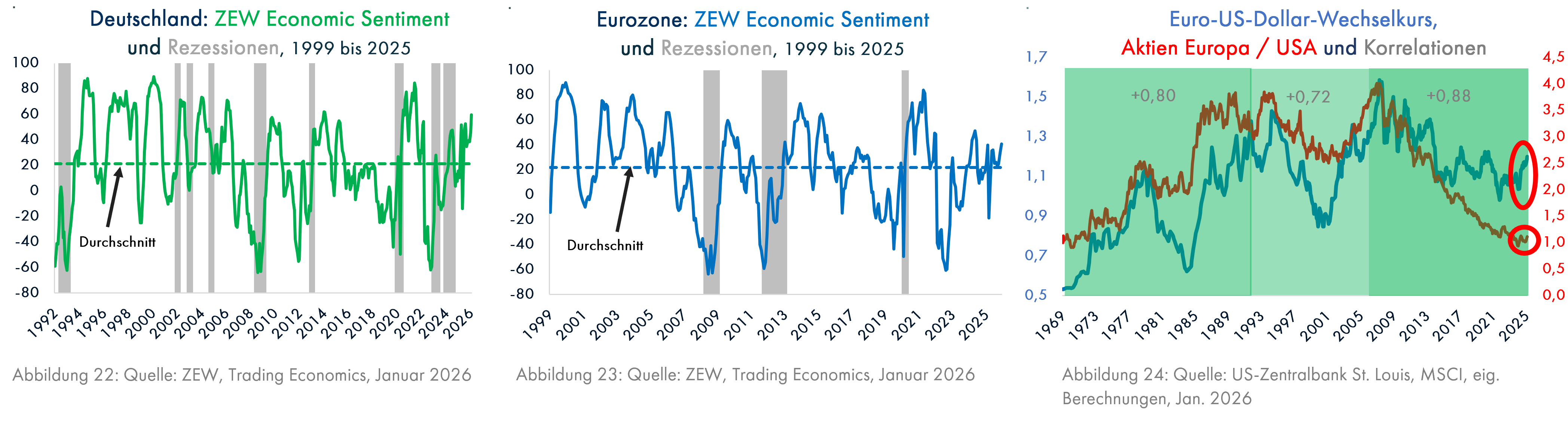 In dieser Welt eines sich stärker zusammenschließenden Europas und einer Verschlechterung der Lage der USA, die im fallenden US-Dollarkurs zum Ausdruck kommt, dürften europäische Aktien besser abschneiden als amerikanische. Die Stimmungsindikatoren des Zentrums für Europäische Wirtschaftsforschung (ZEW), das monatlich die Erwartungen von Analysten und institutionellen Investoren bezüglich der wirtschaftlichen Lage durch Umfragen ermittelt, zeigen den wachsenden Optimismus in Deutschland (Grafik 22) und in der Eurozone (Grafik 23). Wenn die Befragten sehr pessimistisch waren, folgte immer eine Rezession (graue Balken), außer in der Eurozone im Jahr 2023. Dann wurden sie oft schon direkt bei Beginn der Rezession wieder optimistisch. Die aktuell weit überdurchschnittliche Stimmung ist ein zuverlässiger Indikator für eine künftig bessere Lage in der Eurozone und besonders in Deutschland. Bei einem weiter fallenden Wert des Dollars (steigende blaue Linie in Grafik 24) sollte sich die Outperformance Europas seit der Machtergreifung Trumps weiter fortsetzen bzw. die rote Linie weiter steigen.
