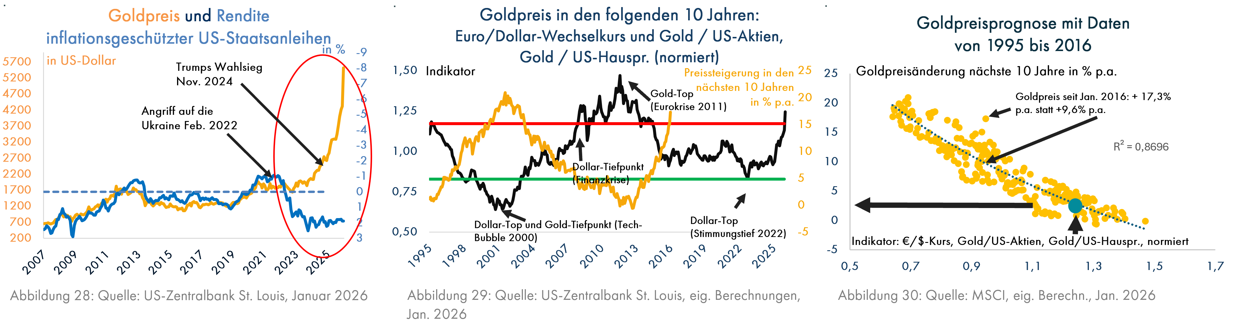 Falls bisher der Eindruck entstanden sein sollte, dass ich Herrn Trump gegenüber kritisch eingestellt bin, so möchte ich dies nun richtigstellen. Trump, ein freundlicher älterer Herr, der nichts als das Wohl seines Landes im Sinn hat, aber auch den Europäern stets wertvolle Hinweise auf die Vorteile einer Stärkung der europäischen Verteidigungsfähigkeit, der Infrastruktur und des EU-Binnenhandels gibt, bewirkt auch für ausländische Kapitalanleger viel Gutes. Damit sind wir beim letzten Thema angekommen, dem Goldpreis. Dieser stand seit der Finanzkrise bis zu Putins Angriff auf die Ukraine in einem sehr engen Zusammenhang mit der Rendite inflationsgeschützter US-Staatsanleihen (Grafik 28). Wenn die Rendite dieser Anleihen, die neben einem jährlichen Zins auch die Erstattung des gesamten Anstiegs der Konsumentenpreise bis zur Fälligkeit der Anleihe garantieren, fiel (Anstieg der invers gezeigten blauen Linie, z. B. von 2007 bis 2013), wurden sie im Vergleich zum zinslosen Gold weniger attraktiv und der Goldpreis stieg an. Entsprechend hätte der Goldpreis nach dem starken Anstieg der Renditen dieser Anleihen ab 2022 von - 1% auf 2% zunächst kräftig fallen und dann stagnieren müssen, wenn es nur um die Inflation ginge. Er blieb aber stabil, weil man mit dem Krieg erhöhte finanzielle Belastungen der Europäer und der USA befürchtete und das Vertrauen in US-Staatsanleihen zu sinken begann. Mit dem Wahlsieg von Trump im November 2024 ging das Vertrauen in die USA in jeder Hinsicht zurück. Der US-Dollar, der wichtigste Einflussfaktor in unserem Prognosemodell, begann ab Februar 2025 zu fallen (die Gründe, warum der Dollar fallen wird, finden Sie hier im Kapitalmarktausblick vom Februar 2025) und der Goldpreis hat sich unter Trumps segensreicher Herrschaft verdoppelt. Jetzt geht es nämlich um die Bonität, insbesondere die der USA, und die wird von Herrn Trumps Politikstil eifrig unterminiert. Der Anstieg war jedoch etwas zu schnell. Der Indikator (schwarze Linie in Grafik 29) hat die rote Linie überschritten. Dadurch ist die Ertragserwartung für die nächsten 10 Jahre auf 3,4% p.a. gefallen (waagerechter Pfeil in Grafik 30).
