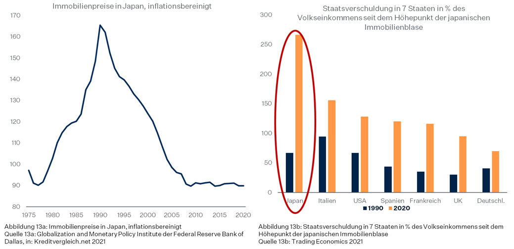 Bis dahin muss aber das Immobilienproblem gelöst werden. In Japan ist seit dem Immobiliencrash ab 1991 die Staatsverschuldung weitaus stärker gestiegen als in den anderen großen Industrieländern (Grafik 12 a und 12 b). In China wird genau das Gleiche passieren. In Italien ist der Zins für langfristige Staatsanleihen seit Jahresbeginn um 300, in den USA und in Deutschland um 200 Basisipunkte gestiegen und in China sogar leicht gefallen. China wird die Wirtschaft stimulieren müssen, indem der Staat den Bürgern ihre Verluste wenigstens teilweise ersetzt und gleichzeitig über Konjunkturprogramme und niedrige Zinsen die Gesamtwirtschaft vor einer schweren Krise schützt.