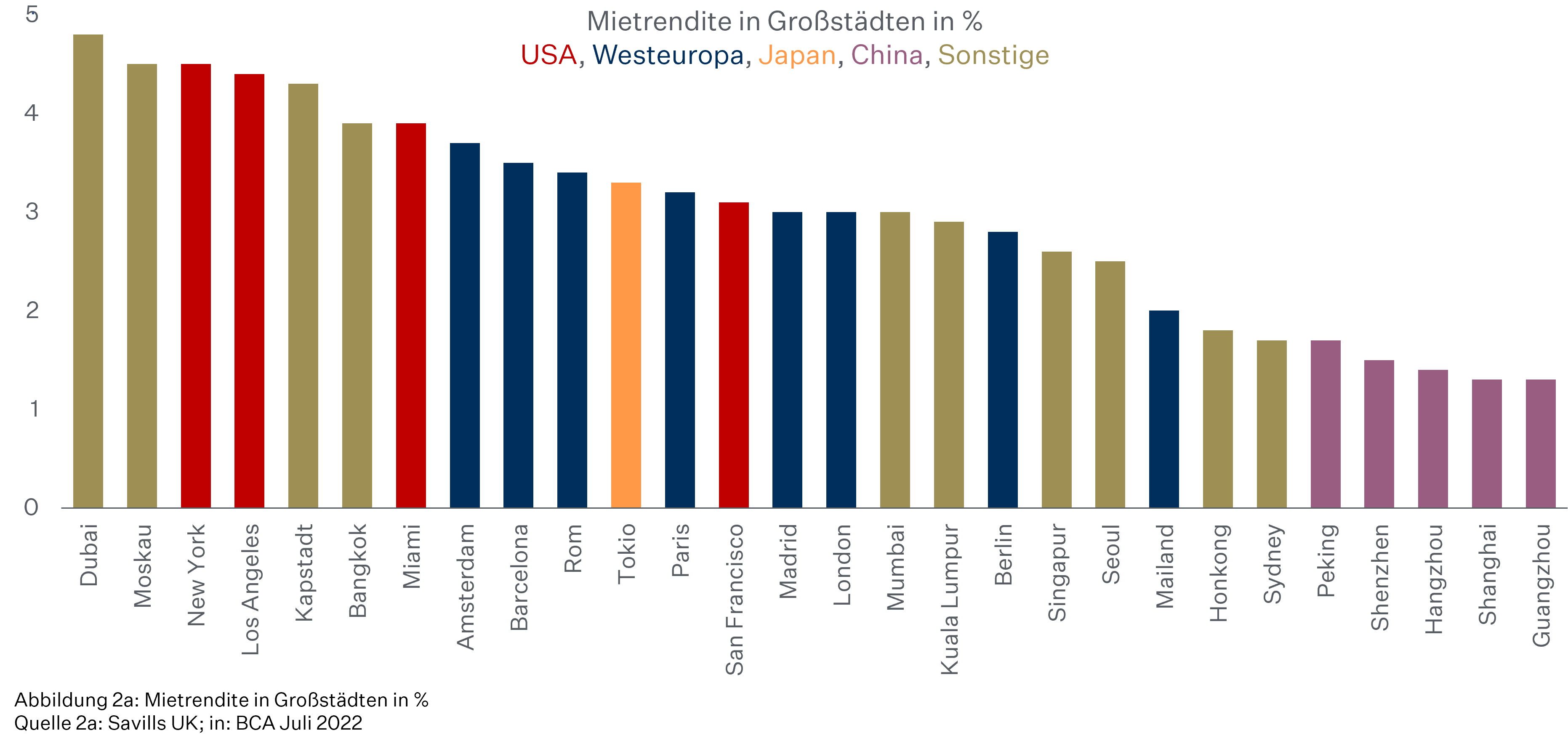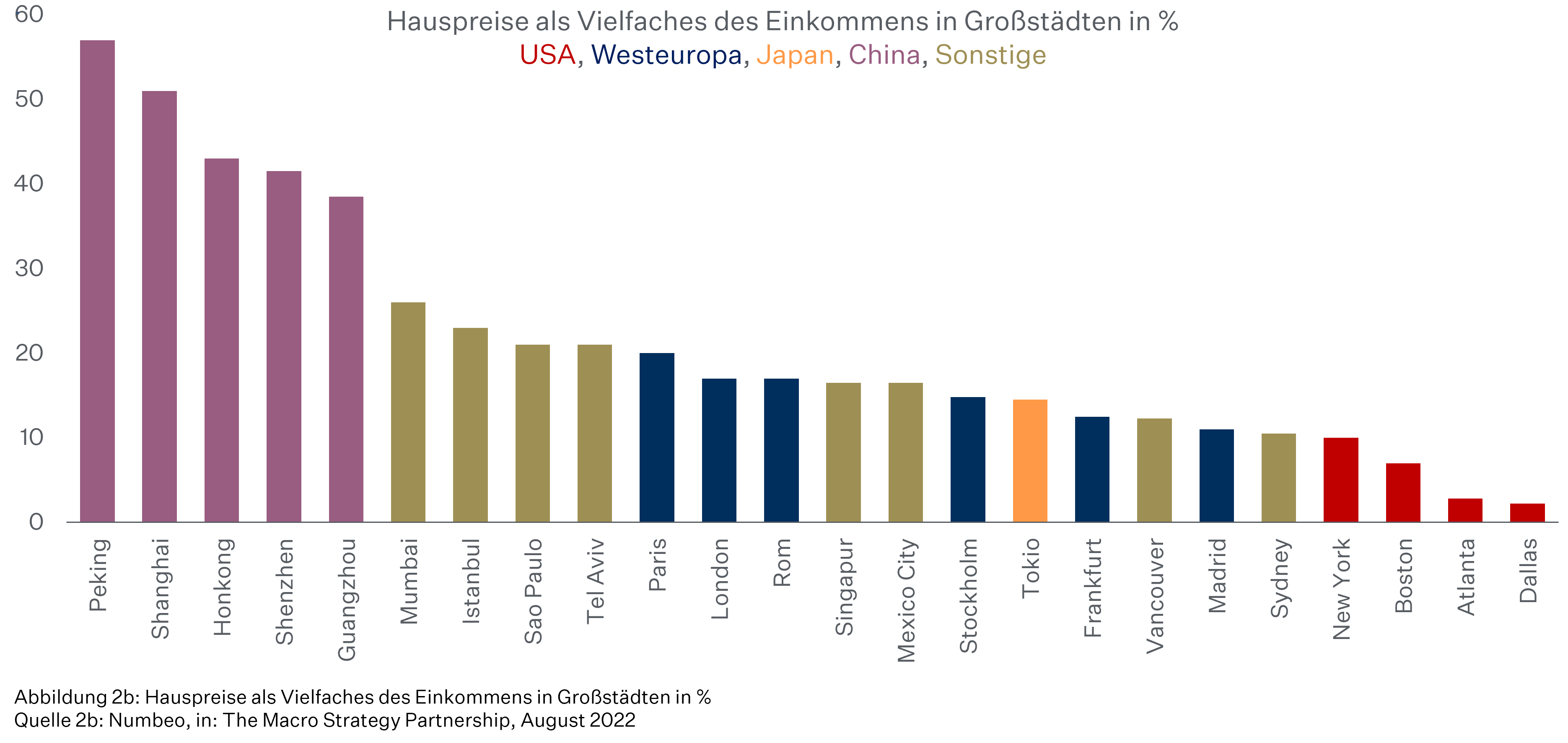 Allerdings sieht dies in dem mit 100.000 Mrd. US-Dollar größten Immobilienmarkt der Welt, dem chinesischen, anders aus. Die Mietrenditen in chinesischen Großstädten sind extrem niedrig und die Hauspreise als Vielfaches des Median-Einkommens der jeweiligen Städte sind besonders hoch (Grafiken 2 a, b).