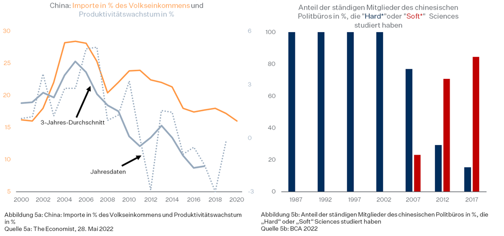 China lenkte seit der Finanzkrise jährlich mehr als 10%; ab 2012 über 14% des Volkseinkommens in Immobilieninvestitionen (siehe Kapitalmarktausblick vom November 2021, den Sie hier finden). In den USA waren es in wenigen Jahren vor der Krise lediglich bis zu 6%, was ausreichte, um die Finanzkrise 2008 auszulösen. In China handelt es sich aber nicht um kollektive Dummheit, sondern es geht um den Machterhalt der kommunistischen Partei. Diese glaubt, mit Investitionslenkung das Wirtschaftswachstum steuern zu können. Der Nachteil ist allerdings, dass viele dieser Investitionen nicht rentabel sind und damit die Schulden für ihre Finanzierung nicht aus den Investitionsrenditen zurückgezahlt werden können. Eine weitere wohlstandmindernde Methode ist die wachsende Abschottung Chinas, das auf möglichst vielen Gebieten autark werden möchte. Die Importe in % des Volkseinkommens hatten vor der Finanzkrise ihren Höhepunkt erreicht und sinken seitdem deutlich (Grafik 5 a). Darunter leidet natürlich das Produktivitätswachstum. Beispielsweise unternimmt China enorme Anstrengungen, um eine eigene Chipindustrie auf Spitzenniveu aufzubauen und hat dafür bereits 50 Mrd. US-$ Staatsgelder investiert, allerdings bisher ohne großen Erfolg. Nach Angaben der amerikanischen Chipindustrie sind bis zu 16.000 Zulieferunternehmen an der Herstellung eines Chips beteiligt. Das könne kein einzelnes Land stemmen (FAZ 18.8.2022). Ein weiterer Bereich der Kapitalverschwendung ist das Projekt „Neue Seidenstraße“, das Xi Jinping 2012 aus der Taufe hob. Bisher wurden 838 Mrd. US-$ in Infrastrukturprojekte, finanziert mit teuren chinesischen Krediten, in Entwicklungsländern investiert. Doch nun häufen sich wegen mangelnder Rentabilität die Probleme. Bereits Kredite im Volumen von 52 Mrd. $ mussten neu verhandelt werden (Spiegel, 20. August 2022).