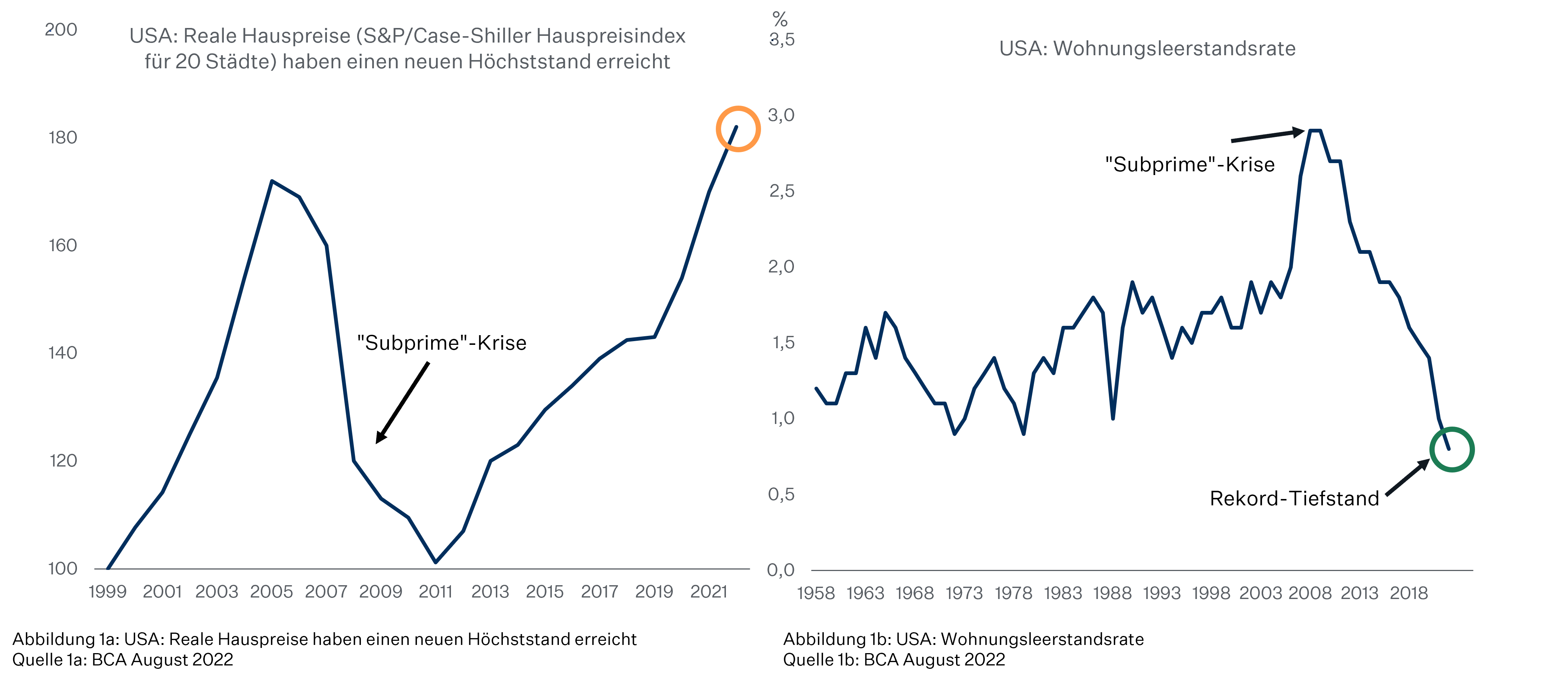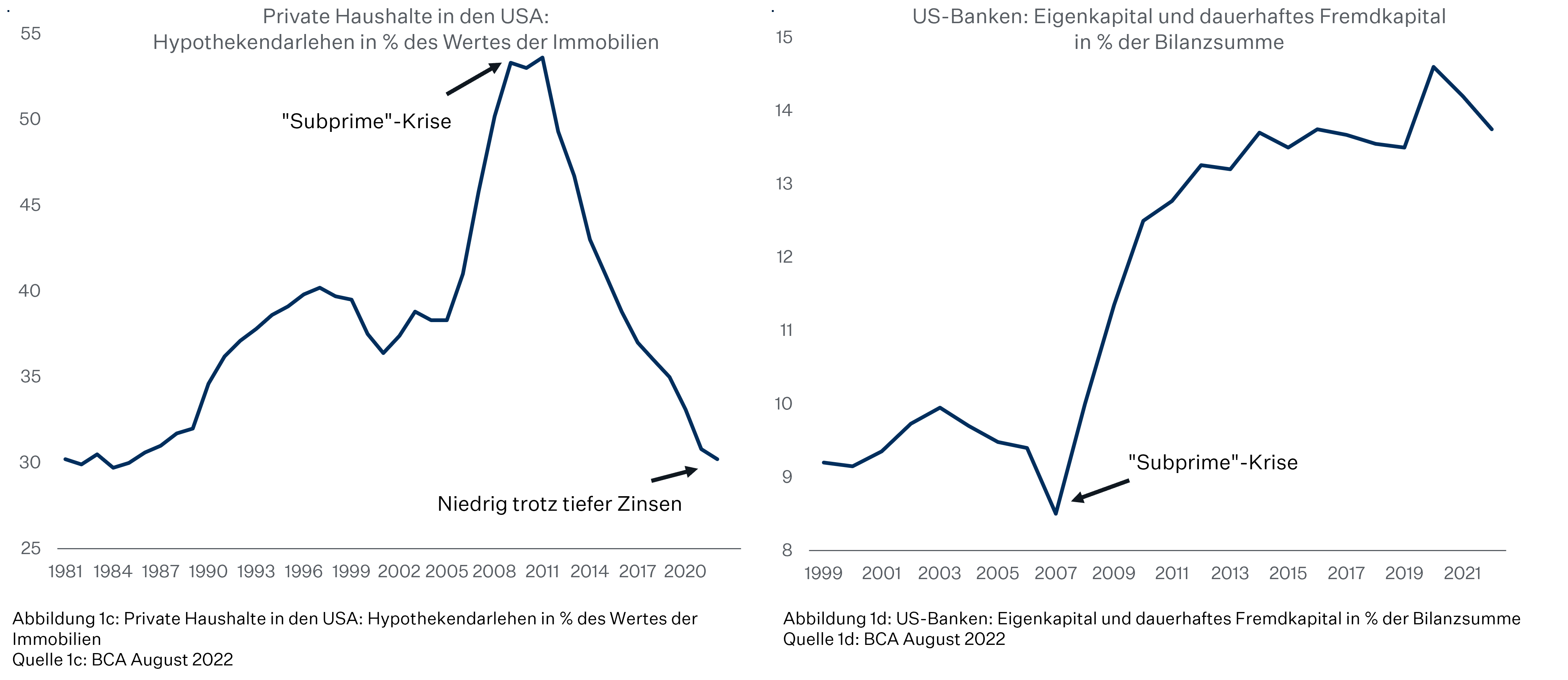 Welche Folgen der Zusammenbruch eines großen Wohnimmobilienmarktes haben kann, zeigte der US-Wohnimmobilienmarkt ab 2007, als der Markt infolge der politisch gewollten laxen Kreditvergabe an bonitätsschwache Hauskäufer („Subprime“) trotz hohem Leerstand (Grafik 1 b) zu teuer geworden war. Der starke Preisrückgang (Grafik 1 a) traf hoch verschuldete Privathaushalte (Grafik 1 c) und eigenkapitalschwache Banken (Grafik 1 d). Das Finanzsystem geriet weltweit in Gefahr, weil die Amerikaner einen großen Teil der Kredite an ausländische Finanzinstitute verkauft hatten. Heute geht jedoch vom US-Markt keine Gefahr aus. Die Hauspreise sind zwar auf ein Rekordniveau gestiegen, aber es gibt kaum leerstehende Wohnungen, weil in den letzten 15 Jahren nur wenige Neubauten entstanden sind (Grafik 4 a). Außerdem sind die Schulden der US-Bürger niedrig und die Banken haben starke Bilanzen.