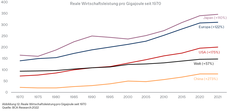 Japan und Europa erwirtschaften mit 1 Gigajoule Energie ungefähr die vierfache, die nicht gerade für sparsame Energieverwendung bekannten Amerikaner immerhin die zweieinhalbfache reale Wirtschaftsleistung; das sollten langfristig auch die Chinesen schaffen (Grafik 12).