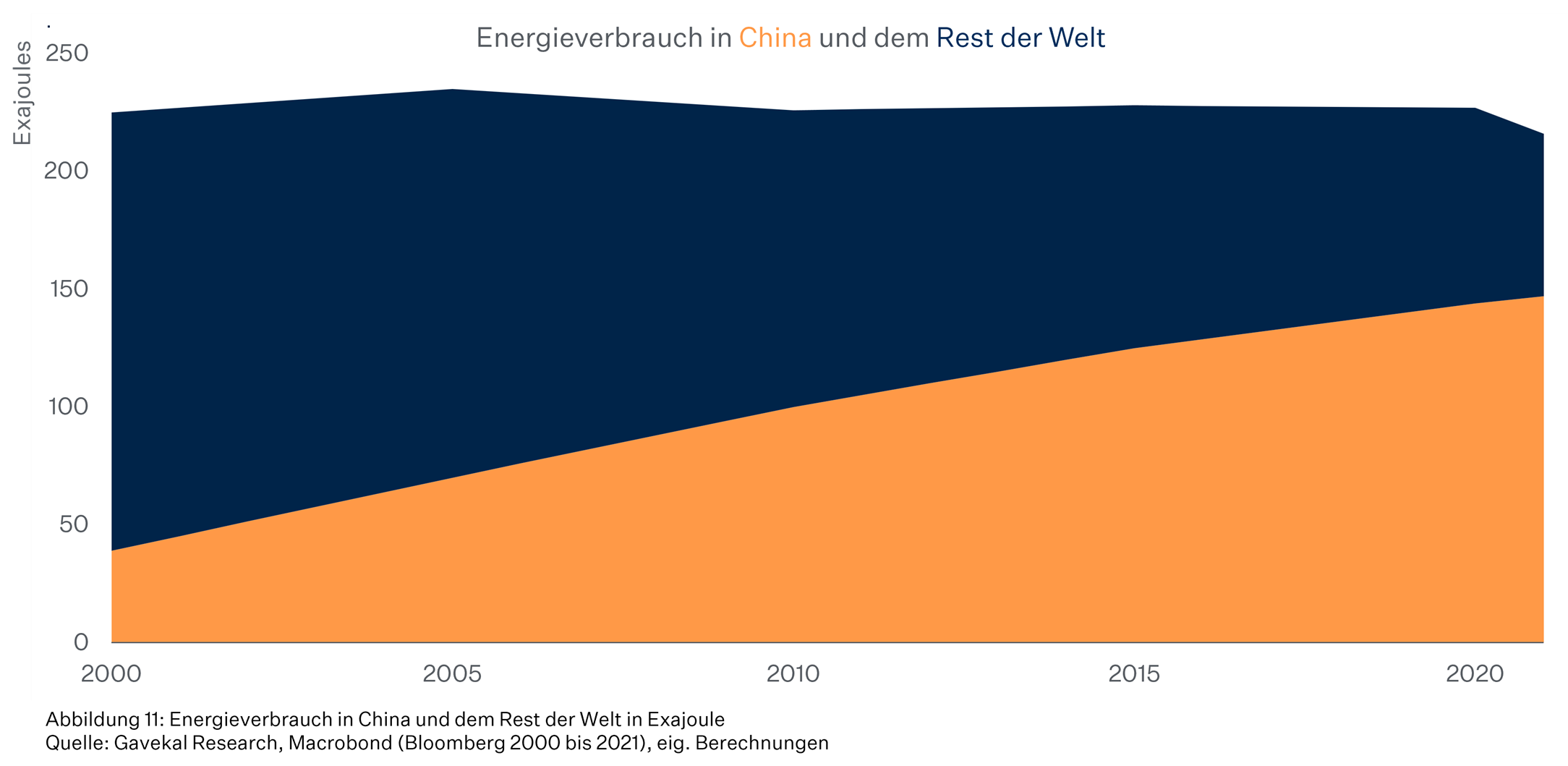 Der absehbare nachhaltige Rückgang der Bautätigkeit im Wohnungs- und Infrastrukturbereich, dessen im weltweiten Vergleich enorme Größe man am chinesischen Zementverbrauch gut ablesen kann (Grafik 9 a), wird nicht nur die Nachfrage nach Rohstoffen, sondern wahrscheinlich auch deren Preise reduzieren und das weltweite Inflationsproblem abmildern. Dies gilt auch für Energierohstoffe. Im Zuge der energieintensiven Aufblähung der Bautätigkeit ist China inzwischen mit weitem Abstand der größte Energieverbraucher der Welt geworden (Grafik 11). Sollte Chinas Wachstum künftig stärker im Konsum- und Dienstleistungssektor stattfinden, wie in den „alten“ Industrieländern, könnte China langfristig moderat wachsen und einen deutlichen Beitrag zur Bekämpfung des Klimawandels erbringen.