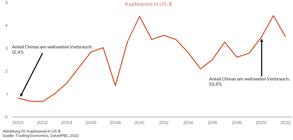 Auch der Anteil Chinas am weltweiten Verbrauch von Industriemetallen, z. B. Kupfer und Aluminium, ist in den letzten 20 Jahren auf über 50% stark angestiegen (Grafik 9 b) und hat damit erheblich zu den Preissteigerungen beigetragen (Grafik 10).