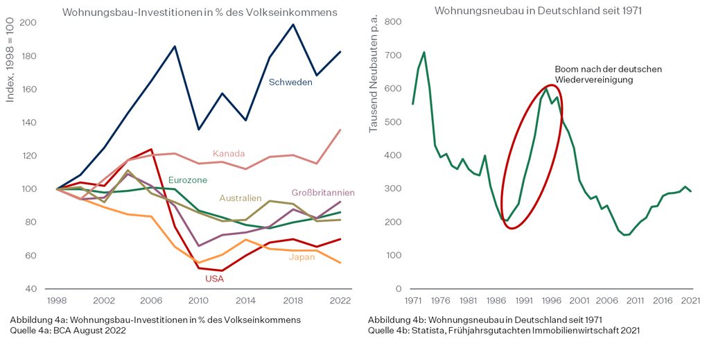 In Schweden und Kanada, den Märkten mit den am stärksten gestiegenen Wohnungspreisen, wurde in den letzten 15 Jahren viel gebaut, so dass hier ein deutlicher Rückgang der Wohnungspreise zu erwarten ist (Grafik 4 a). In Australien und Großbritannien ist diese Gefahr geringer, weil die Neubauaktivitäten seit Jahren nicht besonders hoch waren. In Deutschland sind 2021 sogar wieder weniger Wohnungen als im Vorjahr gebaut worden (Grafik 4 b); im Jahr 2022 dürfte erneut ein deutlicher Rückgang stattfinden, da aufgrund von Handwerkermangel und unkalkulierbaren Baumaterialpreisen viele Neubauprojekte gestoppt werden. Fazit: Nur kleinere Märkte wie Kanada und Schweden sind riskant.