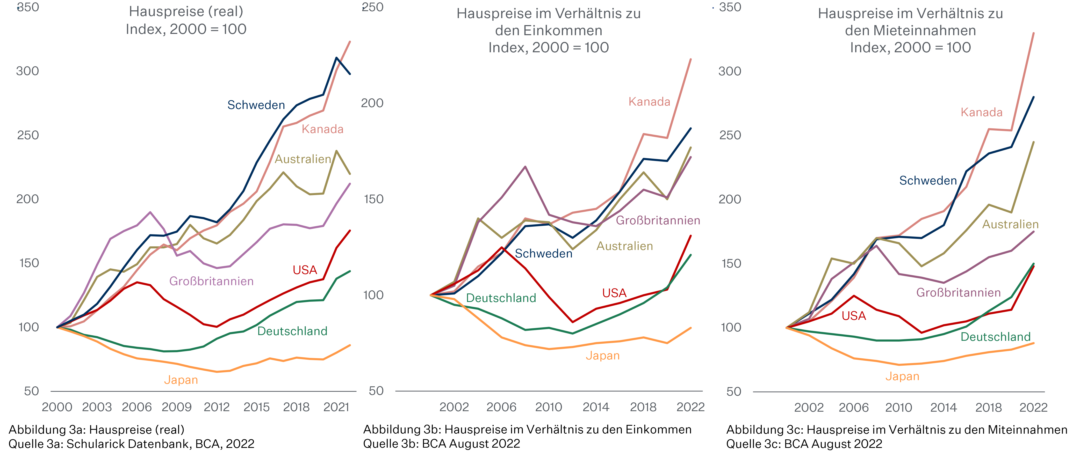 Im internationalen Vergleich ist der US-Wohnimmobilienmarkt daher recht attraktiv. Die absolute Preissteigerung ist moderat (Grafik 3 a). Sowohl relativ zu den Einkommen (Grafik 3 b) als auch zu den Mieteinnahmen (Grafik 3 c) sind die Hauspreise in Kanada, Schweden, Australien und Großbritannien deutlich stärker gestiegen als in den USA, Deutschland und Japan, das sich noch immer nicht von dem Zusammenbruch der japanischen Immobilienblase ab 1991 erholt hat.