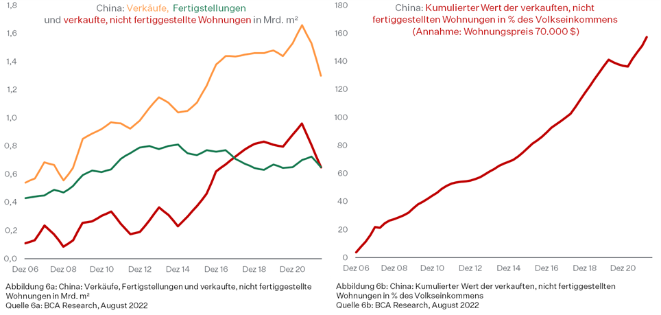 Das Immobilienproblem Chinas hat leider mehrere Dimensionen. Schon die Zahl der fertiggestellten Wohnungen war in den letzten 15 Jahren viel zu hoch (Grafik 6 a, grüne Linie), denn die Zahl der leerstehenden Wohnungen beträgt laut einer Studie der Investmentbank Morgan Stanley vom 2.9.2022 inzwischen atemberaubende 65 Millionen. Bei einer geschätzten Zahl von Wohnungen in China von 650 Millionen (etwas mehr als 2 Bewohner pro Wohnung) wäre das ein Leerstand von 10%, mehr als dreimal so hoch wie der Spitzenwert in den USA seit 1958, nämlich 2,9% während der „Subprime“-Krise (Grafik 1 b).