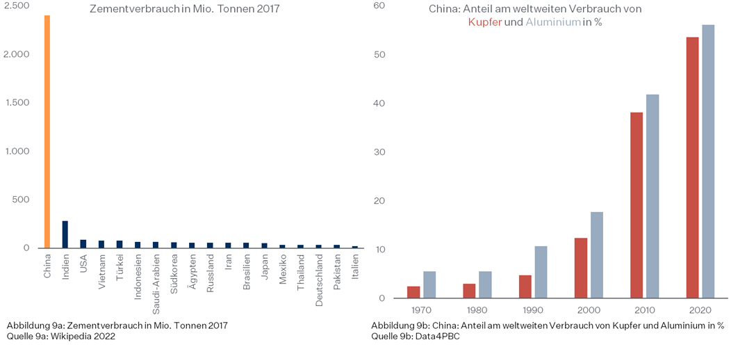 Die absehbaren Verluste der Chinesen werden die Konsumnachfrage deutlich belasten, was sicherlich für die deutsche Autoindustrie ein Problem darstellt, aber auch den weltweiten Inflationsdruck abschwächen dürfte. China hatte nämlich bisher einen sehr hohen Verbrauch an zahlreichen Rohstoffen (Grafik 9 a: China hat im Jahr 2017 mehr als doppelt so viel Zement verbraucht wie die nächsten 17 großen Zementverbraucher).