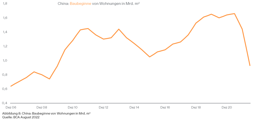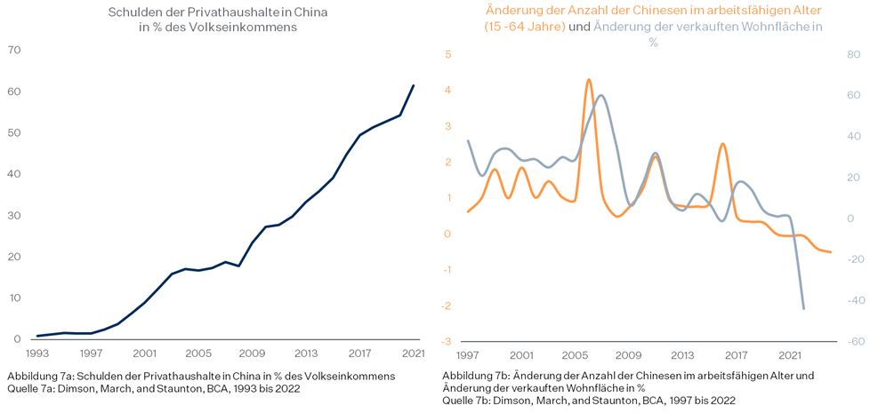 Das nächste Problem ist die Alterung der Bevölkerung. Die Anzahl der Chinesen im arbeitsfähigen Alter, die den Löwenanteil der Immobilienkäufer darstellen, schrumpft seit einigen Jahren (Grafik 7 b). Damit sank auch bisher schon die Nachfrage nach Wohnimmobilien (Grafik 7 b, graue Linie).