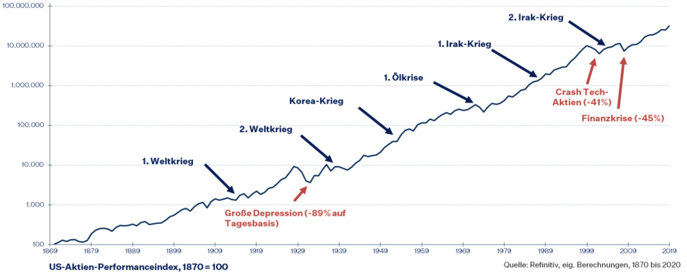Damit kommen wir zu der Frage, ob und wo angesichts der vielen Unsicherheiten am Kapitalmarkt entsprechende große Risiken bestehen. Die nachfolgende Grafik zeigt, dass politische Krisen wie Kriege oder die durch den arabisch-israelischen Konflikt ausgelöste 1. Ölkrise nicht zu nachhaltig dramatischen Kurseinbrüchen am US-Aktienmarkt geführt hatten.