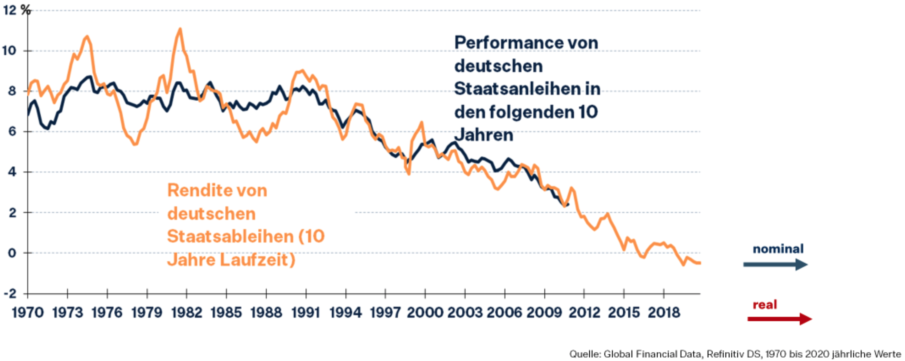Schon mit den etwas solideren deutschen Staatsanleihen wird man künftig ein Drittel seines Vermögens pro Dekade verlieren. Es ist intellektuell faszinierend, dass solche Anlagen für Altersvorsorgeprodukte nicht nur erlaubt sind, sondern auch noch vorgeschrieben werden.