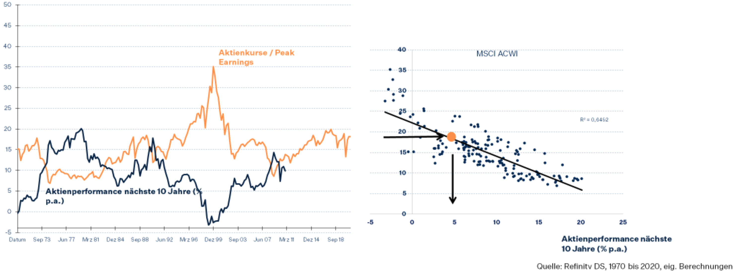 Aktien sind zwar weltweit nicht mehr billig, aber weisen noch immer einen überdurchschnittlichen Renditeaufschlag zu Staatsanleihen auf und sollten ca. 5% Performance p.a. in der nächsten Dekade erwirtschaften. Außerdem dürften Aktien anders als in den 70er Jahren von steigender Inflation jahrelang profitieren können.