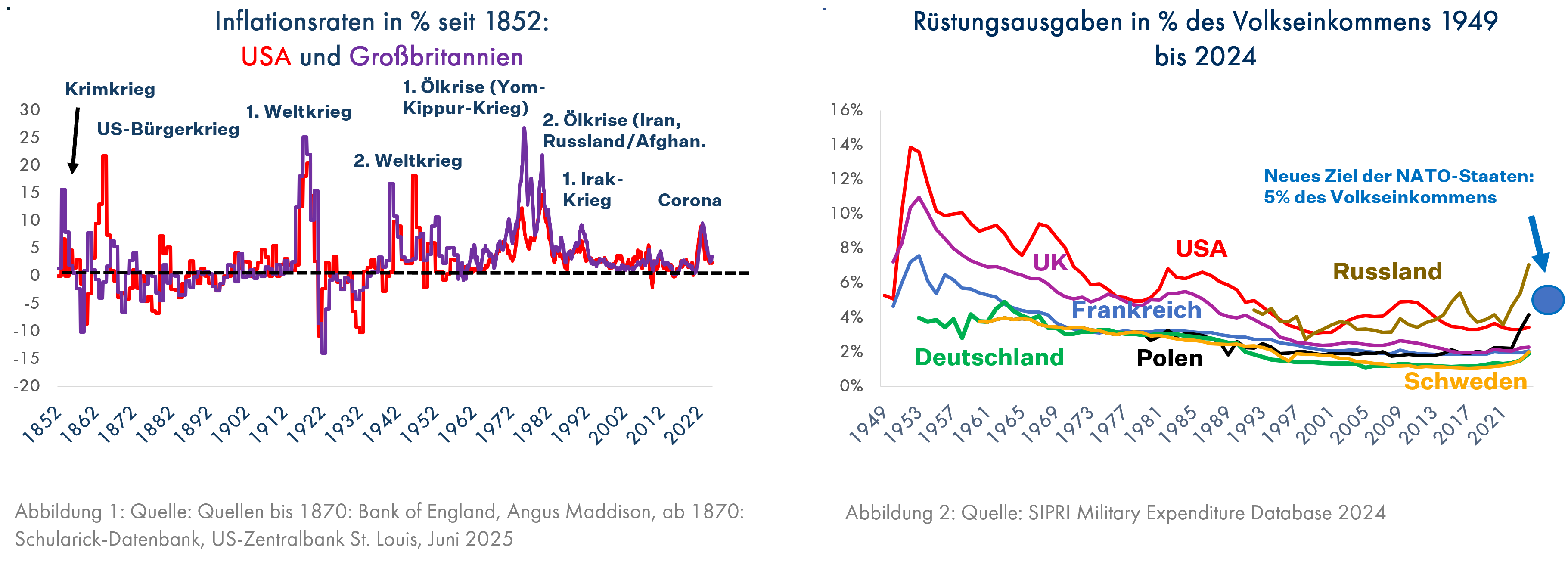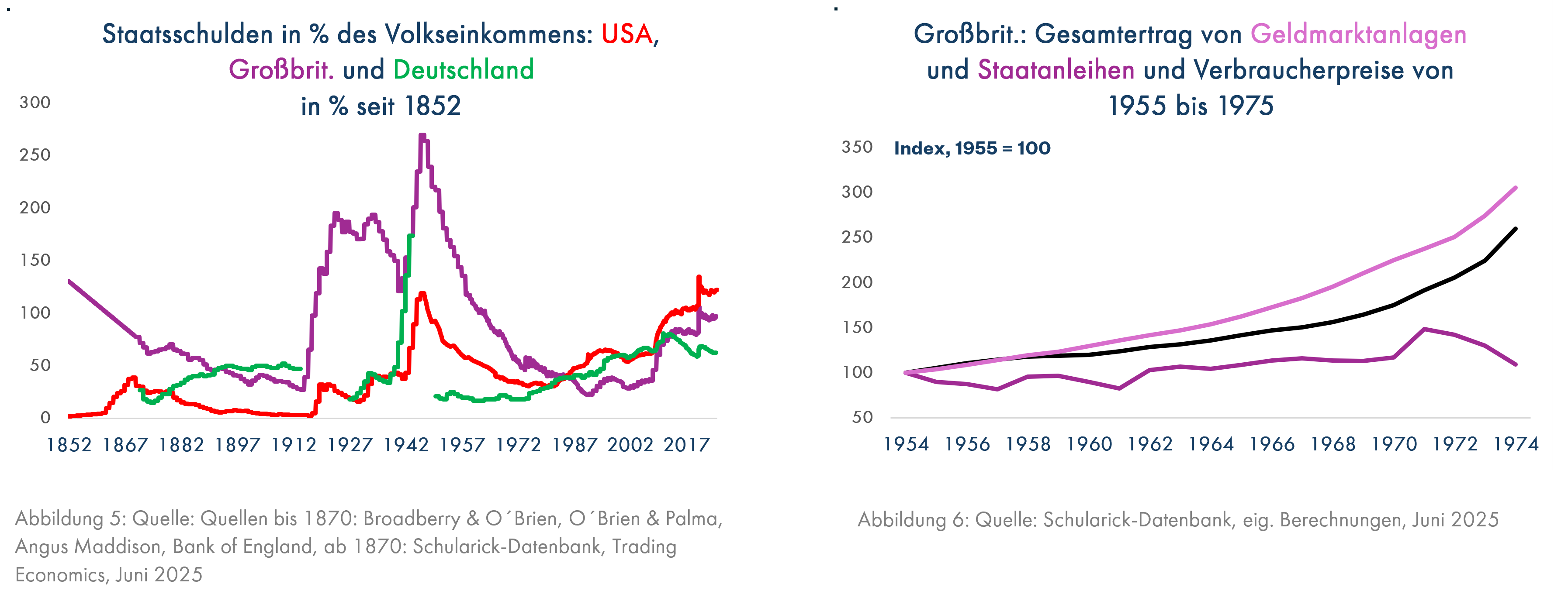 Seit die heutigen wissenschaftsbasierten Industrie- und Dienstleistungsgesellschaften im 19. Jahrhundert entstanden waren, führten hauptsächlich Kriege zu Inflationsschüben. Diese waren in der Zeit der Goldwährung, die in vielen Ländern schon zu Beginn des 1. Weltkrieges endete, in England oder in den USA kein Problem für die Käufer von Staatsanleihen, da auf jede kurze Inflation auch eine Deflation folgte und die Preise nicht nachhaltig stiegen. Darauf vertrauten die Anleger in diesen beiden Ländern allerdings auch noch bis zur Zeit nach dem 2. Weltkrieg, übersahen dabei aber die durch diesen Krieg entstandene riesige Staatsverschuldung, zu deren Rückführung beide Regierungen Inflation und künstlich niedrig gehaltene Zinsen brauchten. Es folgten ab 1960 ruhige Zeiten mit einer Inflationsphase von 1965 bis 1980, die bei festverzinslichen Anlagen zu deutlichen realen Verlusten und bei Aktien zu unterdurchschnittlichen Erträgen führten. Wohnimmobilien brachten stabil positive Erträge; Aktien profitierten stark von Zeiten niedriger Inflation, eine Folge der durch die gesunkene Staatsverschuldung bis 1980 möglich gewordenen Überwindung der Inflationsmentalität. Aktuell besteht das Risiko, dass die Anleger die wieder massiv verschlechterte Lage der Staatsfinanzen in vielen Ländern, insbesondere in den USA, ignorieren und die durch Trumps Politik erhöhten Inflationsrisiken deutlich unterschätzen, da eine Brechung einer aufkeimenden Inflationsmentalität durch sehr hohe Geldmarktzinsen für einen hochverschuldeten Staat wie die USA nicht möglich ist und von Trump, der auf besonders niedrige Zinsen setzt, mit Sicherheit nicht geduldet würde.
