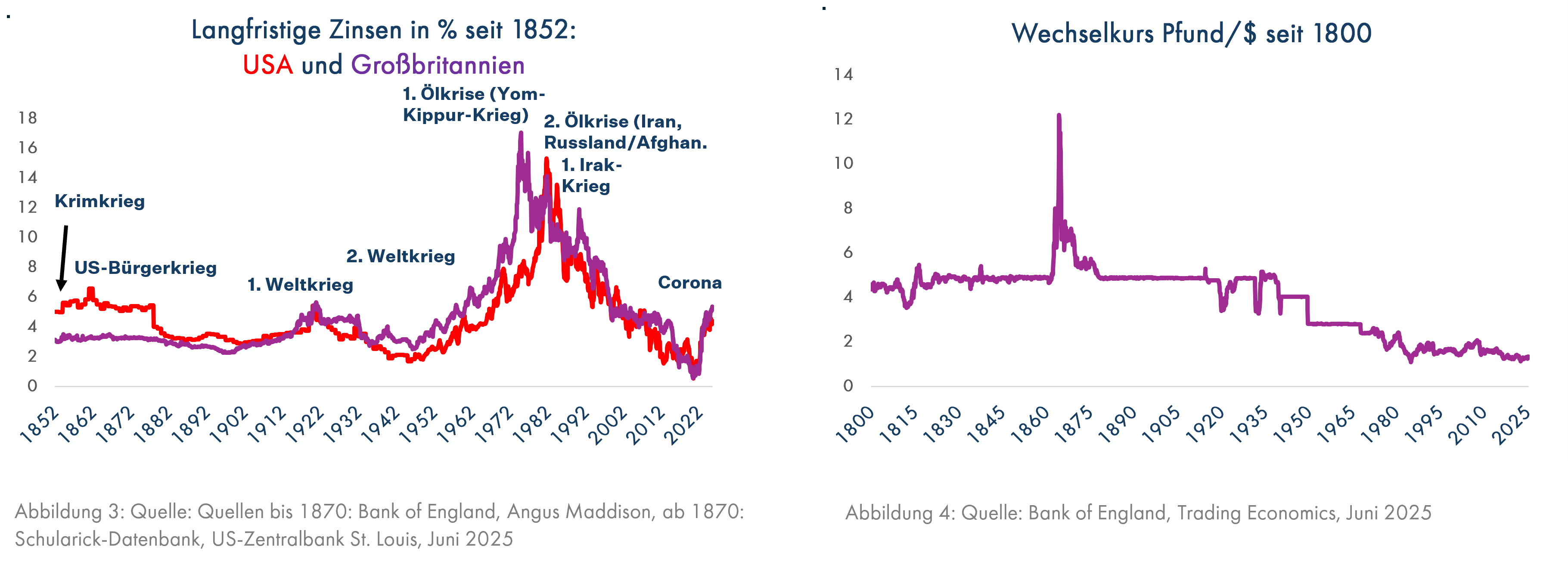 Auch die Wechselkurse lassen nur während der napoleonischen Kriege bis 1815 leichte Schwankungen des Britischen Pfundes zum Dollar der (an diesem Krieg nicht beteiligten) USA erkennen. Der amerikanische Bürgerkrieg von 1861 bis 1865 hinterließ allerdings deutliche Spuren am Devisenmarkt; zeitweilig brauchten die Nordstaatler der USA über 12 US-Dollar statt der davor und danach üblichen 4,8, um 1 Britisches Pfund kaufen zu können (Grafik 4, die Währung der im Bürgerkrieg unterlegenen Südstaaten ging in einer Hyperinflation unter, Quelle: Bryan Cutsinger, Joshua Ingber, Seigniorage in the Civil War South, 2018).