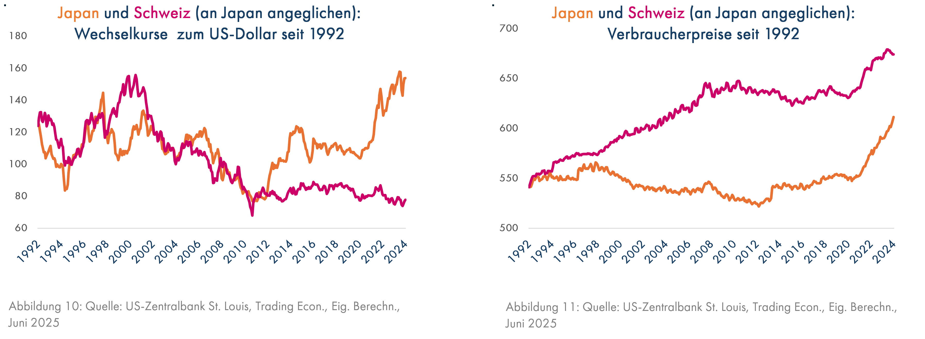 Auch bei den „starken” Währungen im unteren Bereich der Grafiken 7 und 8 lässt sich die Bedeutung der Staatsschulden erkennen. Im Jahr 1992 brauchte man nur 124 Yen, im Dezember 2024 aber 154 Yen, um einen US-Dollar kaufen zu können (Grafik 10). Dagegen reichten für den Kauf eines Dollars im Dezember 2024 63% der Anzahl Schweizer Franken, die man 1992 dafür benötigte. Die Kaufkraft des Franken hatte sich also relativ zum Yen weitaus besser entwickelt, obwohl die Verbraucherpreise in der Schweiz stärker gestiegen waren, der Franken also gerechnet in den Preisen Schweizer Waren mehr Kaufkraft verloren hatte (Grafik 11).