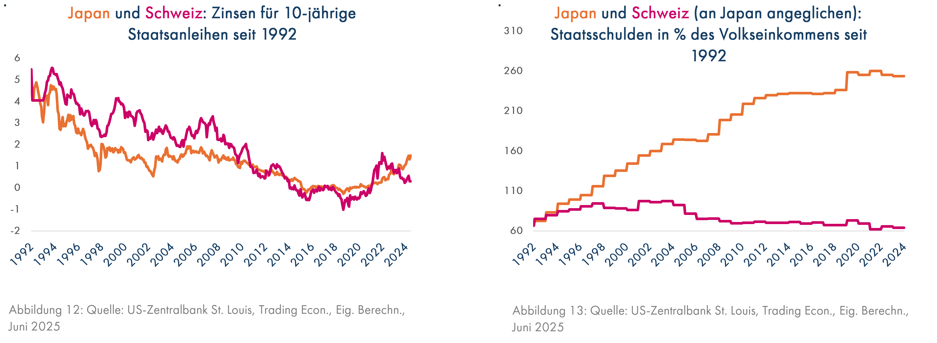 Auch die Zinsentwicklung sprach nicht für den Franken, da die Zinsen in Japan in den letzten Jahren deutlich stärker zugelegt hatten (Grafik 12). Aber die Entwicklung der Staatsverschuldung ist das große japanische Problem (Grafik 13), das bis 2010 am Devisenmarkt völlig ignoriert und bis 2020 kaum wahrgenommen wurde.
