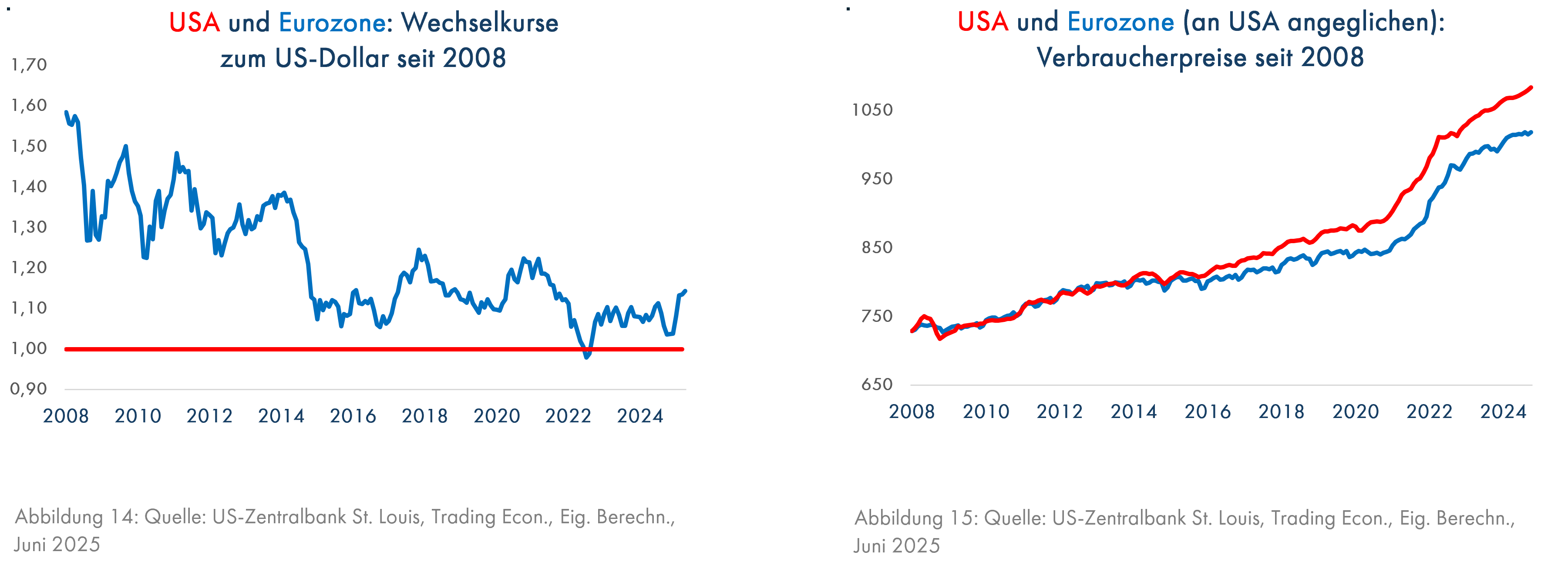 Ähnliches dürfte sich künftig beim US-Dollar abspielen. Dieser hatte seit der Finanzkrise im Jahr 2008, als man fast 1,60 US-Dollar brauchte, um einen Euro kaufen zu können, stark aufgewertet; Ende Februar 2025 genügten 1,03 US-Dollar für den Kauf eines Euros (Grafik 14), obwohl die Inflationsentwicklung für den Dollar ungünstig war (Grafik 15).