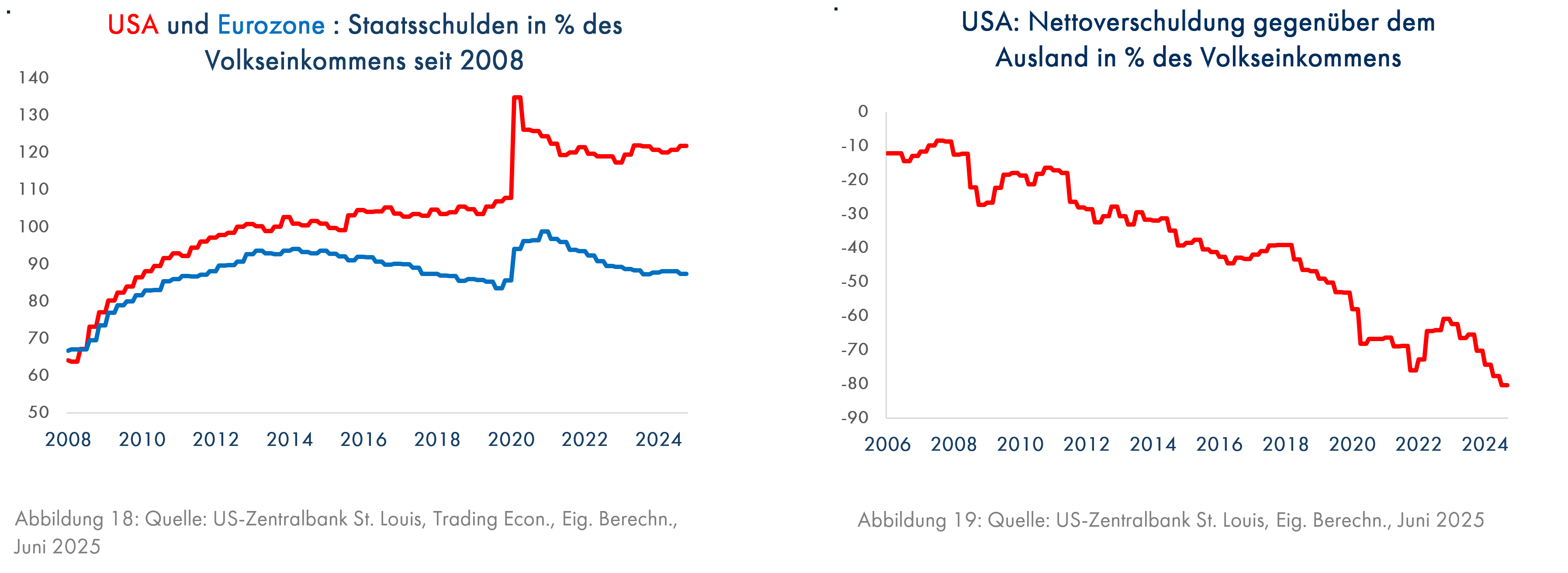 Die starke Aufwertung von knapp 1,60 US-Dollar/Euro im Jahr 2008 auf aktuell 1,17 hat zu einer moderaten Überbewertung von noch gut 10% geführt (Grafik 16, die blaue Linie im grünen Kreis bedeutet, dass man ungefähr 10% zu wenig Dollars für den Kauf eines Euros benötigt). Angesichts der enormen Ausweitung der Staatsschulden der USA relativ zur Eurozone (Grafik 18) sollte der Dollar allerdings bereits deutlich unterbewertet sein, wie es der Yen aufgrund der hohen Staatsschulden ja seit einigen Jahren ist. Man hat das schuldengetriebene Wachstum der USA bis zuletzt jedoch als Zeichen der wirtschaftlichen Stärke interpretiert. Auch die außergewöhnlich große Kapitalzufuhr aus dem Ausland (Grafik 19) hat die US-Wirtschaft und den Dollarkurs angetrieben. Ziehen die Ausländer ihr Kapital aus den USA ab, wird der Dollar fallen. Dieser Prozess könnte jetzt begonnen haben; neue Daten kommen am 30. Juni.